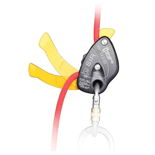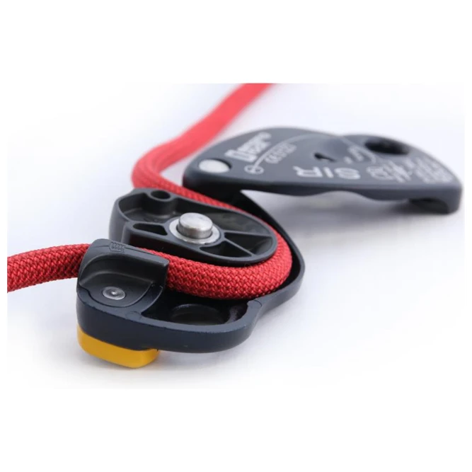 Durch Ziehen des Hebels in die äußerste Position wird das Anti-Panik-System aktiviert, was zu einer vollständigen Blockierung des Seils führt. Durch leichtes Ziehen am Hebel wird der rotierende Daumen nach und nach freigegeben und das Seil rutscht durch. Die Seilmontage ist dank der Piktogramme auf dem Bremskörper einfach und intuitiv. Es eignet sich ideal für den Seilzugang oder die Rettung beim Industrieklettern.
