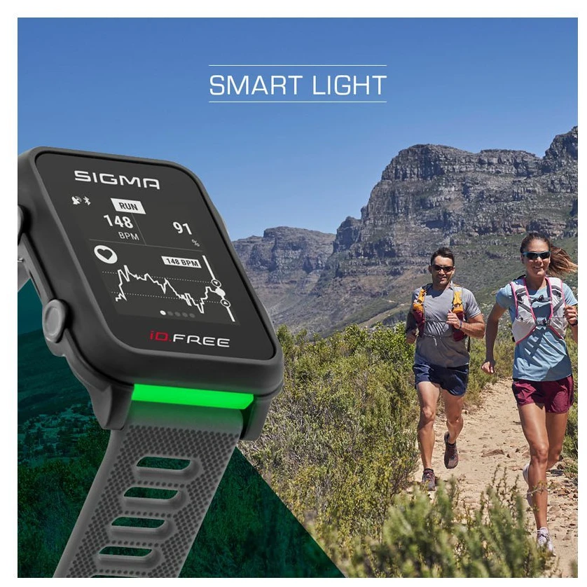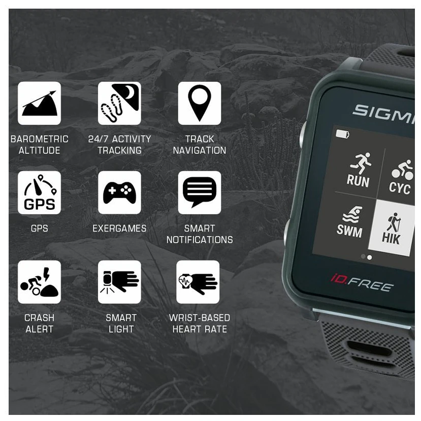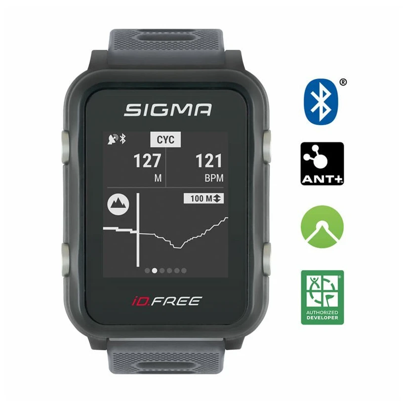 Multisportuhr für Outdoorsportler und Abenteurer Sigma Ausweis.FREE kann praktisch überall verwendet werden. Es überzeugt durch sein schlichtes, schlankes Design, die intuitive Steuerung und die Konnektivität über Bluetooth und ANT+. Dadurch ist es möglich, die Uhr nicht nur mit einem Smartphone, sondern auch mit externen Sensoren (Herzfrequenz, Geschwindigkeit, Trittfrequenz, Leistung) zu verbinden.