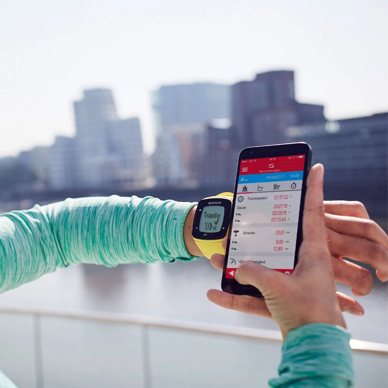 Der GPS-Empfänger wertet die zurückgelegte Distanz und Geschwindigkeit aus und zeigt diese präzise an. Anschließend können Sie im Data Center-PC-Programm oder in der mobilen Sigma Link-Anwendungalles übersichtlicher anzeigen, entweder per drahtloser NFC-Übertragung oder über das mitgelieferte USB-Kabel. Beide Anwendungen werden automatisch über die Sigma Cloud synchronisiert, sodass Sie auf beiden Geräten ständigen Zugriff auf Ihre Daten haben. Das Lauftraining kann in automatische oder benutzerdefinierte Runden unterteilt werden. Es können bis zu 99 Runden mit Zeit- und Distanzangaben aufgezeichnet werden. Genauere Informationen zu den Schaltungen stehen Ihnen dann in den angeschlossenen Anwendungen zur Verfügung.