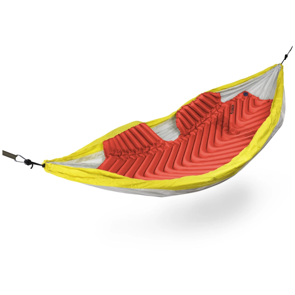Die aufblasbare Isomatte für die Hängematte Insulated Hammock V der amerikanischen Marke Klymit lässt sich in 15-20 Atemzügen auf eine angenehme Dicke von 7,6 cmaufblasen. Zudem lässt sich die Isomatte auf eine Größe knapp über einer Literflasche packen und nimmt somit kaum Platz weg. Es wiegt 1021 Gramm und ist mit allen Standard- Hängemattenkompatibel.