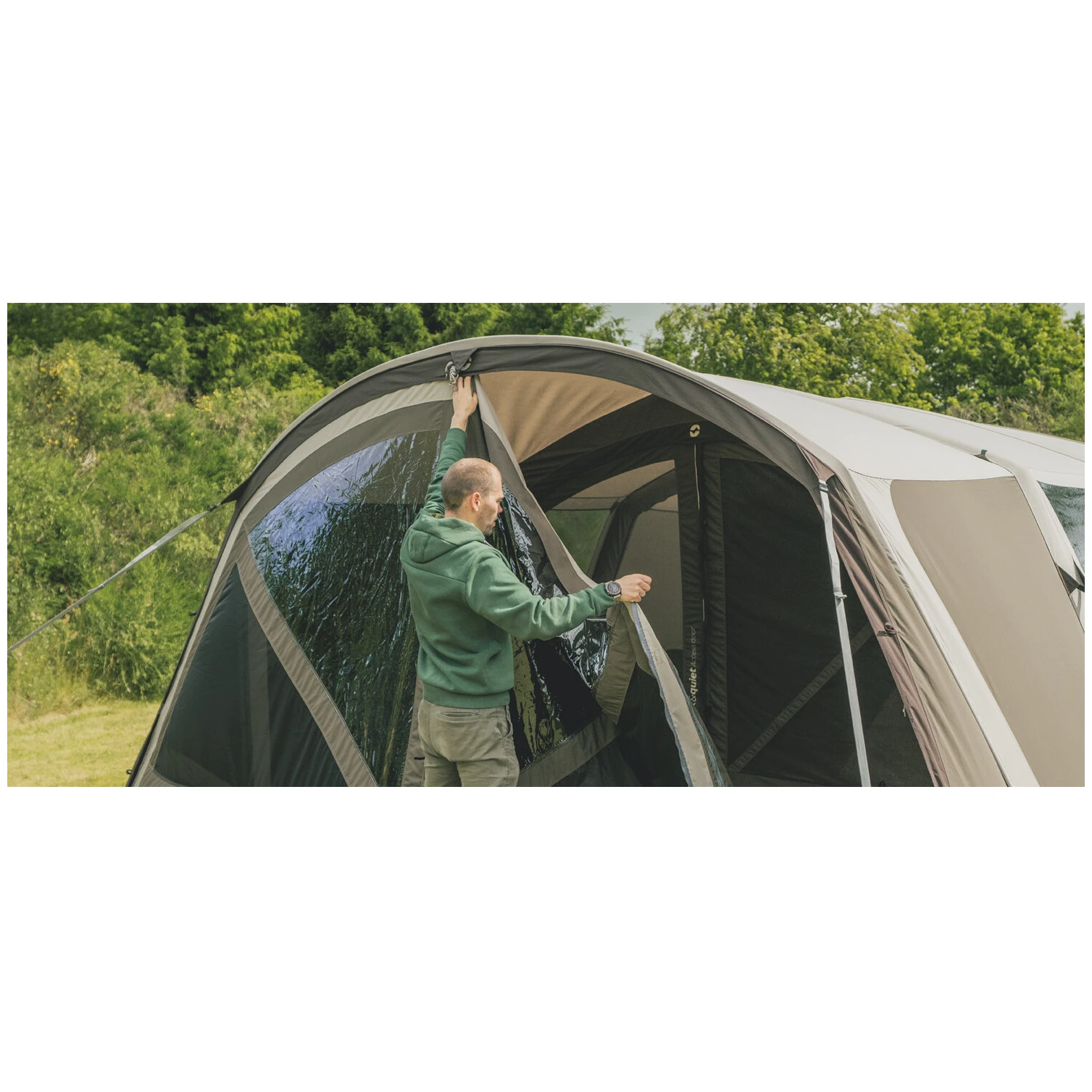 Den ersten Teil des Zeltes bildet das Vordach, das mit einer abnehmbaren Vorderwand komplett verschlossen werden kann, um Platz für zusätzliche Ausrüstung zu schaffen. Zu diesem Abschnitt kann auch ein Boden hinzugefügt werden. Anschließend gelangt man in die Halle, die Sie über einen barrierefreien Eingang mit geräuschlosem Schließen durch Magnetstreifen Schnell und leise erreichen. Für einen dichteren Verschluss steht ein Reißverschluss zur Verfügung. Die Türen lassen sich komplett zur Seite schieben. Die geräumige Halle verfügt über ein Lichtdach und große getönte Fenster, sodass für viel Licht gesorgt ist, gleichzeitig aber vor direkter Sonneneinstrahlung und UV-Strahlung geschützt ist. Für mehr Privatsphäre sind die Fenster mit Vorhängen mit Reißverschluss ausgestattet.