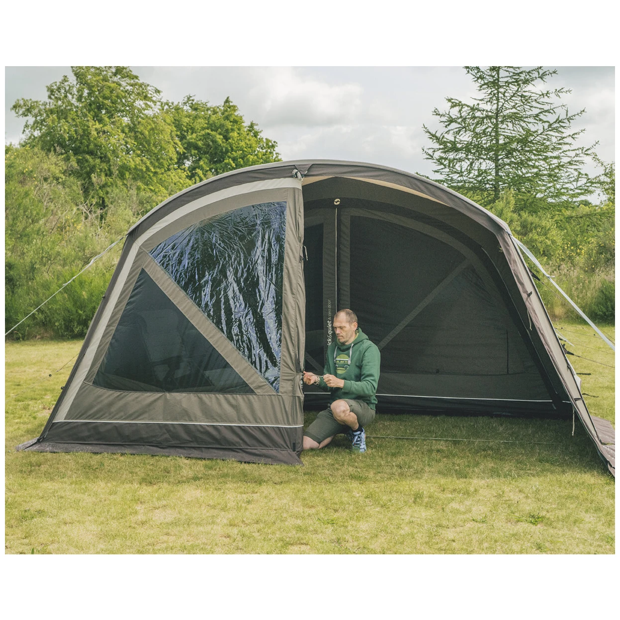 Den ersten Teil des Zeltes bildet das Vordach, das mit einer abnehmbaren Vorderwand komplett verschlossen werden kann, um Platz für zusätzliche Ausrüstung zu schaffen. Zu diesem Abschnitt kann auch ein Boden hinzugefügt werden. Anschließend gelangt man in die Halle, die Sie über einen barrierefreien Eingang mit geräuschlosem Schließen durch Magnetstreifen Schnell und leise erreichen. Für einen dichteren Verschluss steht ein Reißverschluss zur Verfügung. Die Türen lassen sich komplett zur Seite schieben. Die geräumige Halle verfügt über ein Lichtdach und große getönte Fenster, sodass für viel Licht gesorgt ist, gleichzeitig aber vor direkter Sonneneinstrahlung und UV-Strahlung geschützt ist. Für mehr Privatsphäre sind die Fenster mit Vorhängen mit Reißverschluss ausgestattet.