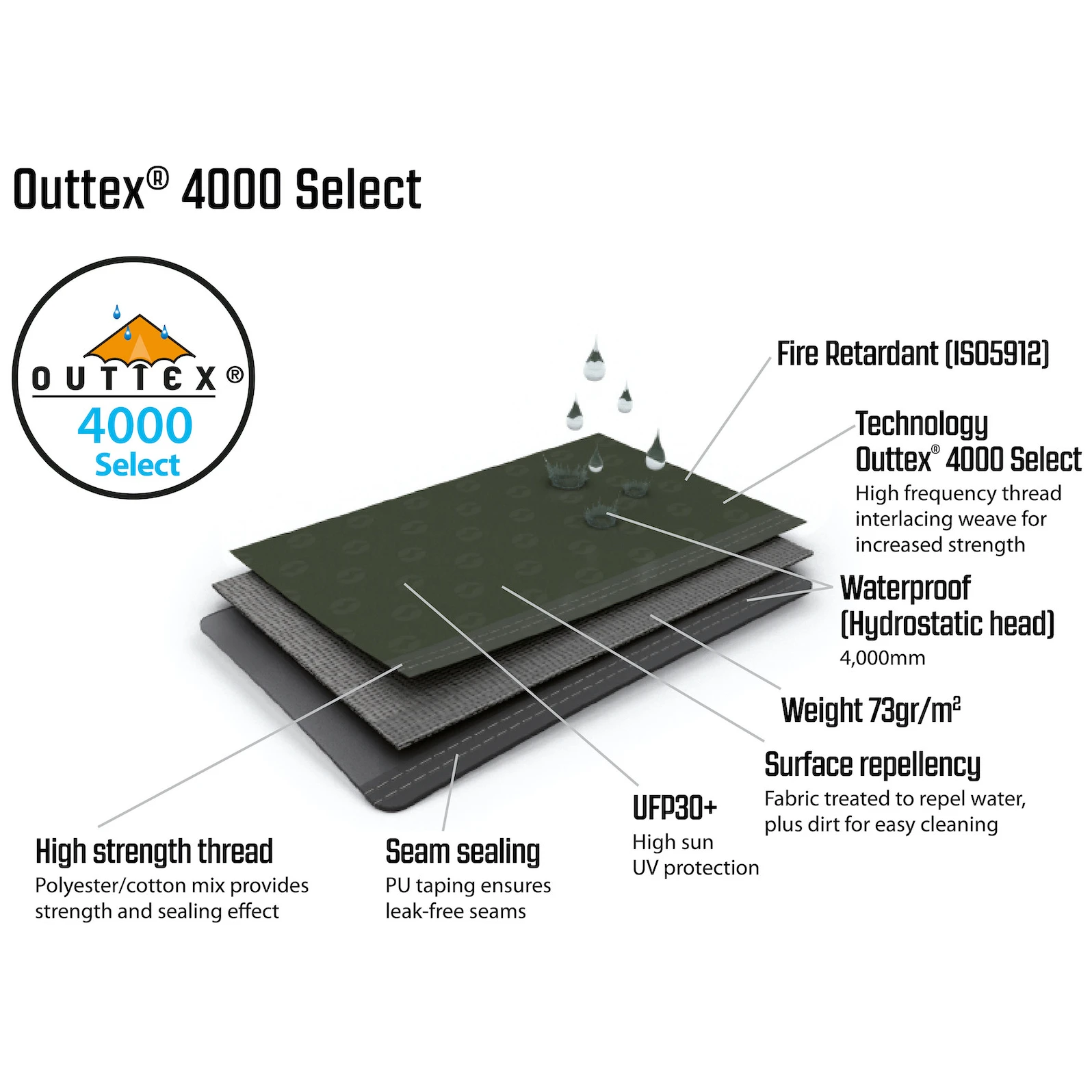 - Außenzelt: Outtex® 4000 Select (100 % Polyester, PU-Beschichtung, verschweißte Nähte, UFP30+, feuerhemmend)