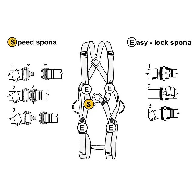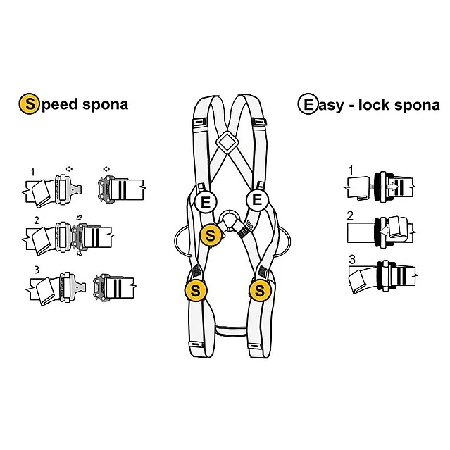 Ganzkörper-Arbeitsgurt Body II Speed von Singing Work zur Absturzsicherung – mit drei SPEED-Schnallen, die ein schnelles und bequemes Anlegen des Gurtes ermöglichen.