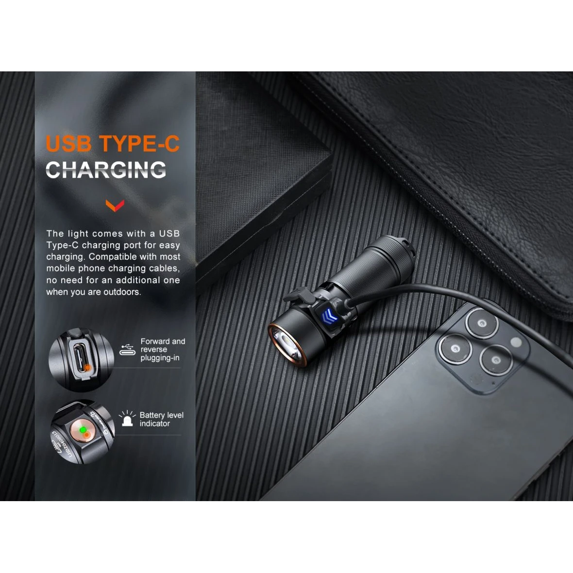 - Im Lieferumfang enthalten sind ein Akku Fenix ARB-L16-700P, ein USB-C-Ladekabel, ein Tragegurt und ein Ersatz-O-Ring