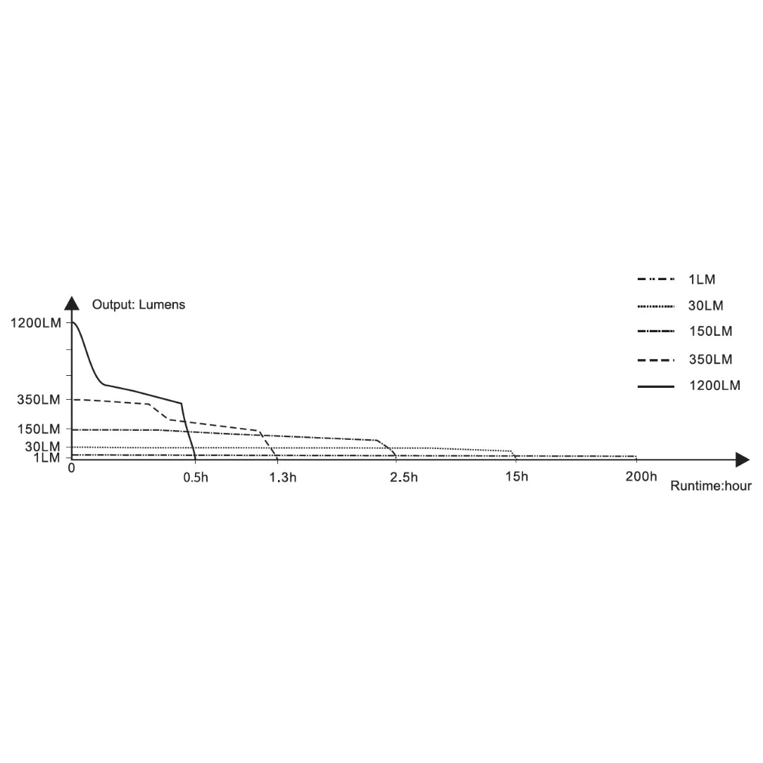 - sechs Leistungsmodi: 1200 Lumen (30 Minuten) -> 350 Lumen (1,3 Stunden) -> 150 Lumen (2,5 Stunden) -> 30 Lumen (15 Stunden) -> 1 Lumen (200 Stunden) -> Stroboskop (1200 Lumen)