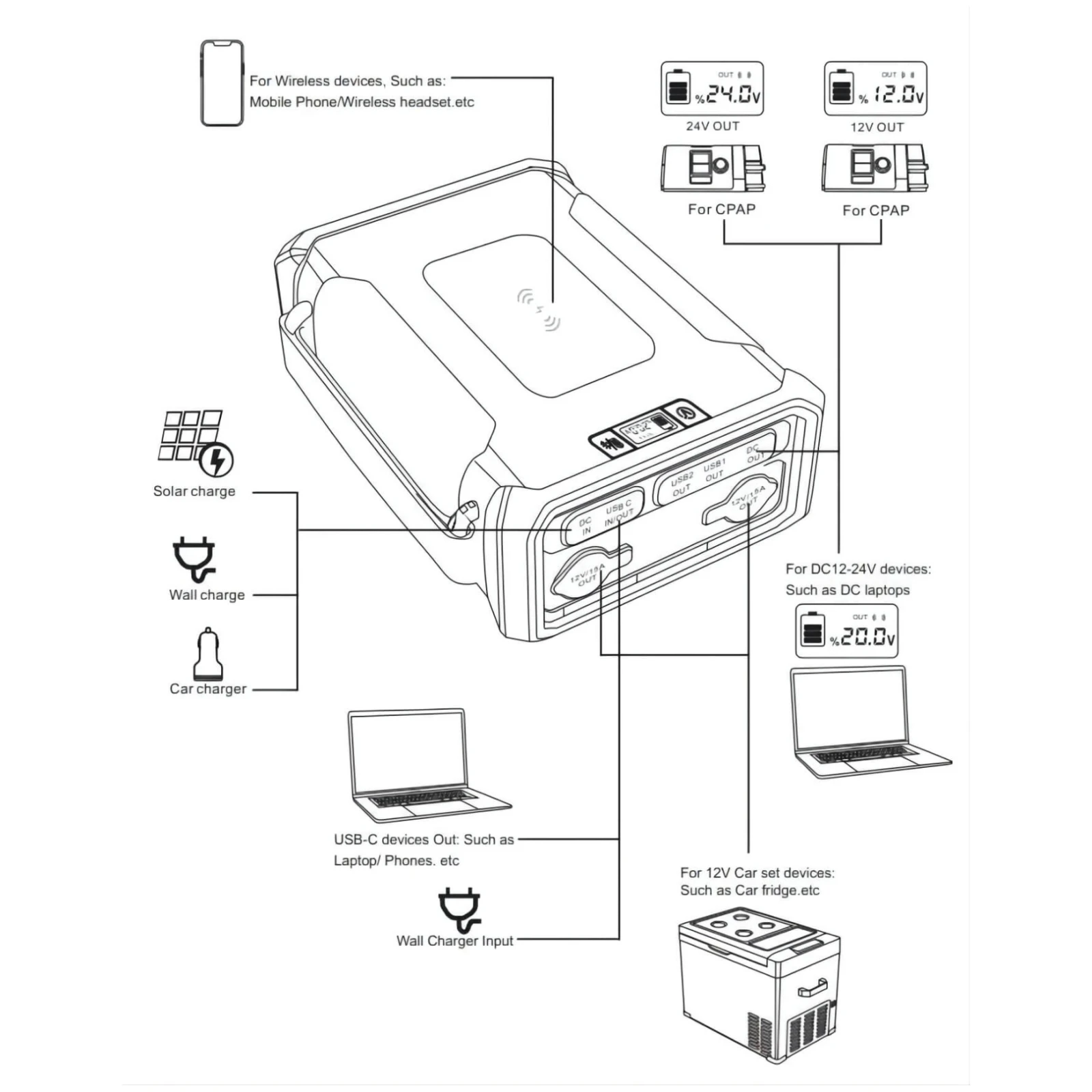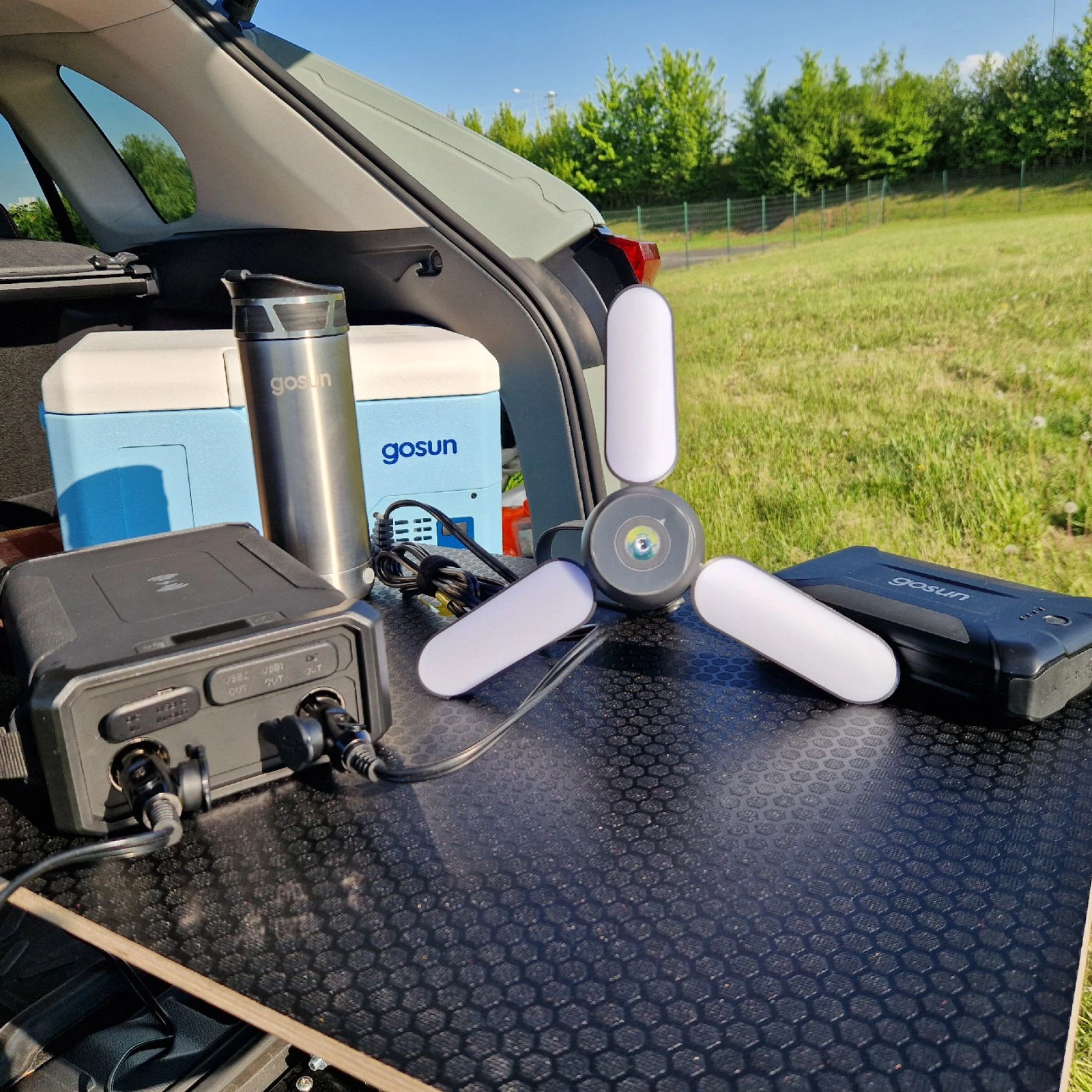 Die einzigartige Ladestation Gosun mit einer enormen Kapazität von 307,2 Wh / 96.000 mAh ist groß genug, um Ihr Smartphone fast einen Monat lang jeden Tag aufzuladen. Die Powerbank ist mit einer Vielzahl von Anschlüssen für verschiedene Ladearten Ihrer Geräte mit 12/24V ausgestattet.