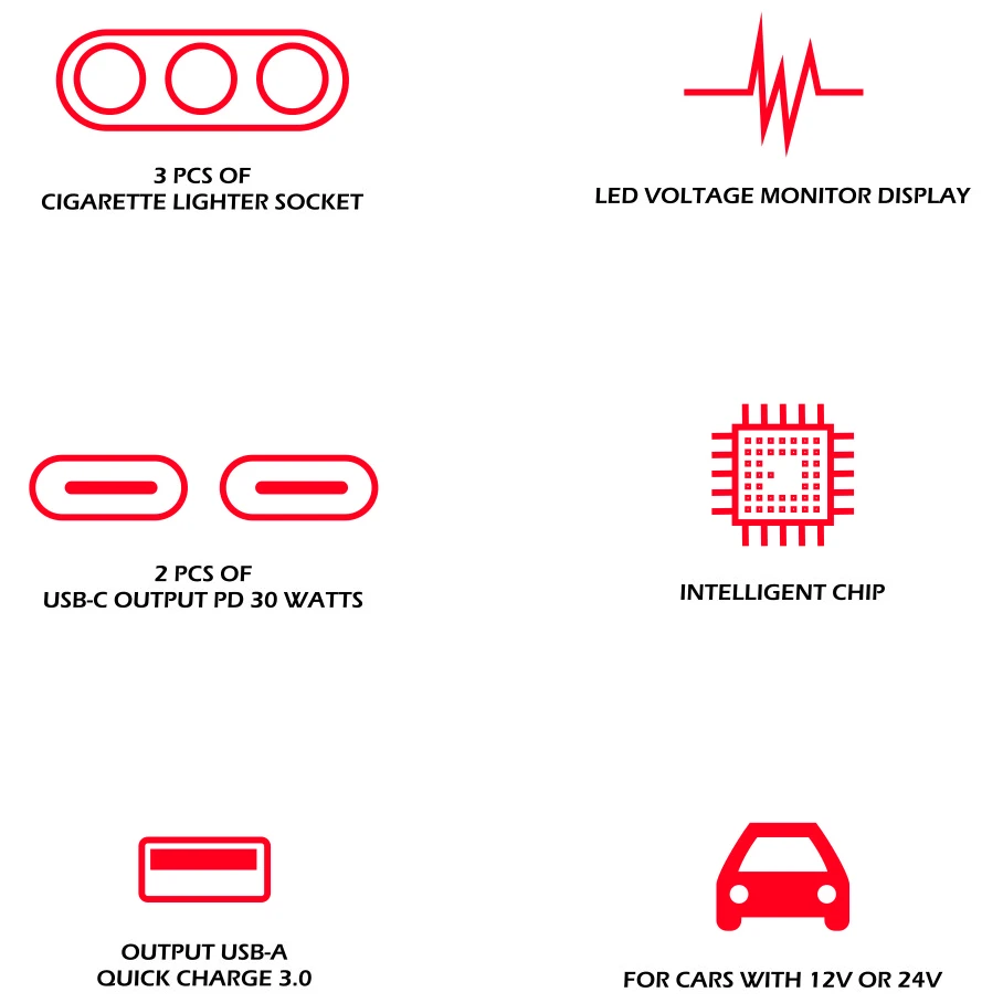 Der Adapter bietet außerdem einen USB-A-Anschluss mit Qualcomm 3.0-Schnellladen (für Android) und 2 USB-C-Anschlüsse mit einer Leistung von 30 W, die das PowerDelivery-Schnellladen (für Apple) unterstützen. Der Adapter verfügt außerdem über eine LED-Anzeige, auf der Sie den Spannungszustand der Autobatterie in Echtzeit ablesen können.