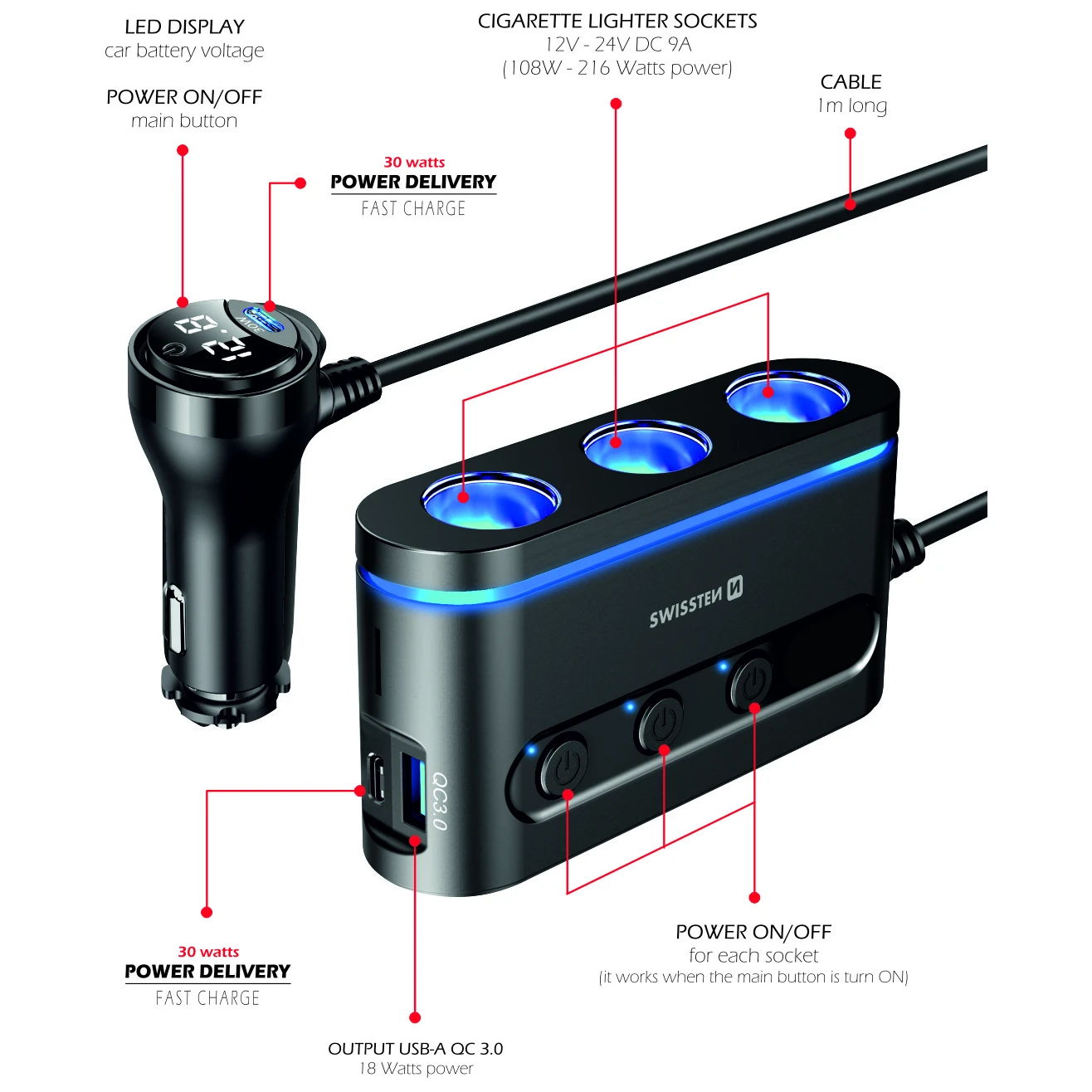 Der Autoladeadapter 108 W – 216 W der Marke Swissten ist die perfekte Wahl für jedes Auto und erweitert die Ladeports um 5 weitere Ausgänge. Der Vorteil dieses Adapters liegt darin, dass durch den Anschluss der Zigarettenanzünderausgang nicht verloren geht, im Gegenteil. Dank 3 CL-Ausgängen können Sie gleichzeitig einen Autokühlschrank, eine Kamera und einen Radarwarner anschließen (Gesamtleistung 108–216 W).