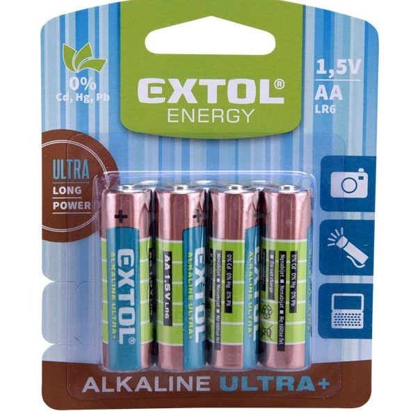 Die langlebigen Alkaline-AA-Batterien Extol Ultra+ eignen sich für anspruchsvollere Geräte wie Kameras, Taschenlampen, GPS-Navigation, Player usw.