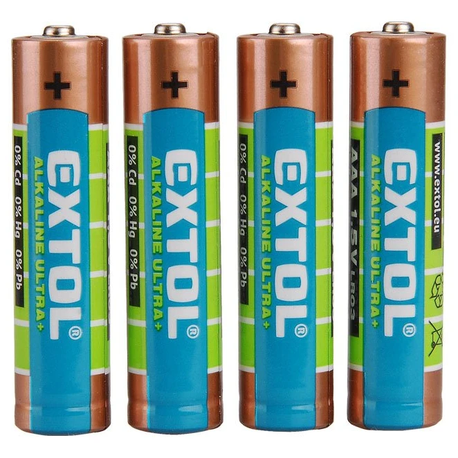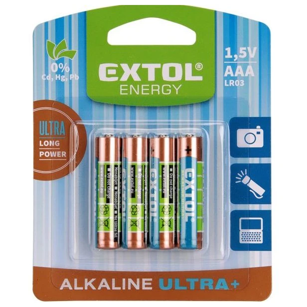 Die langlebigen AAA Alkaline Batterien Extol Ultra+ eignen sich für anspruchsvollere Geräte wie Kameras, Taschenlampen, GPS-Navigation, Player usw.