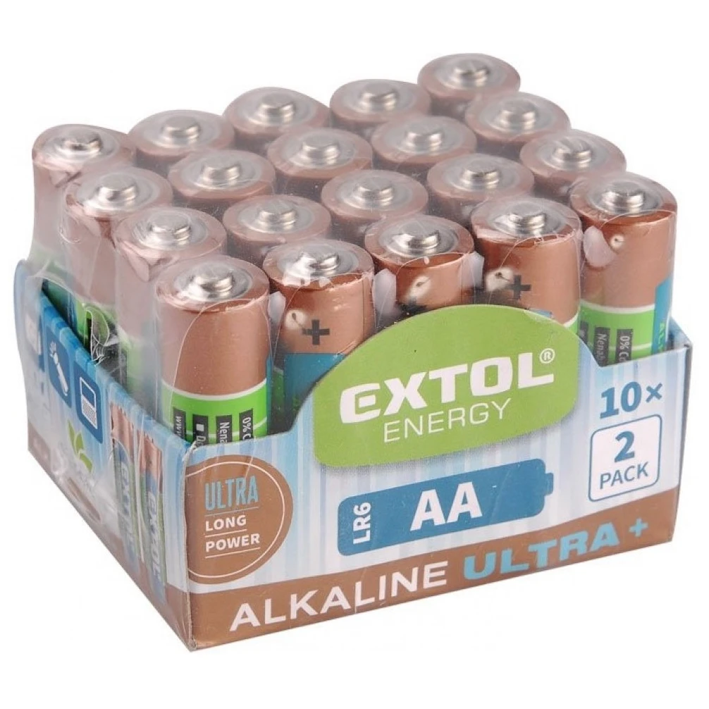 Alkaline-Batterien 1,5 V AA (LR06) Extol, geeignet für alle Geräte mit höherem Verbrauch und betrieben mit AA Batterien. Sie zeichnen sich durch eine hohe Langlebigkeit aus. Vergessen Sie nicht, Altbatterien bei einer Sammelstelle abzugeben.