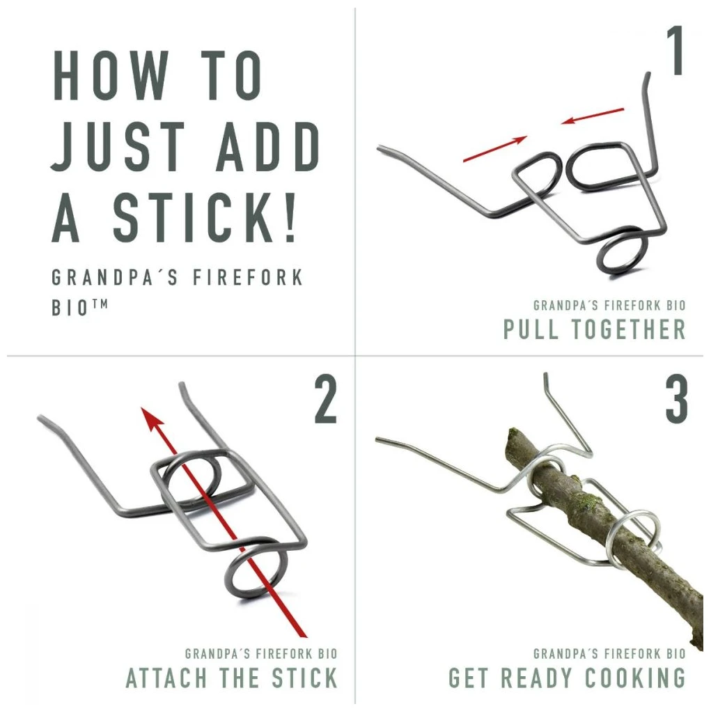 Grandpa‘s FireFork BIO 2er-Pack vom Hersteller Light My Fire ist ein Set aus zwei Grillgabeln. Sie bestehen aus rostfreiem Stahl und die Schutzkappe an der Spitze besteht aus Biokunststoff. Das intelligente Design des gebogenen Drahtes ermöglicht das Toasten von Marshmallows bis hin zu Speck. Die Gabel lässt sich auf jeden beliebigen Ast oder Mast auffädeln, so entlastet man die Bäume und muss keine frischen Äste abschneiden.
