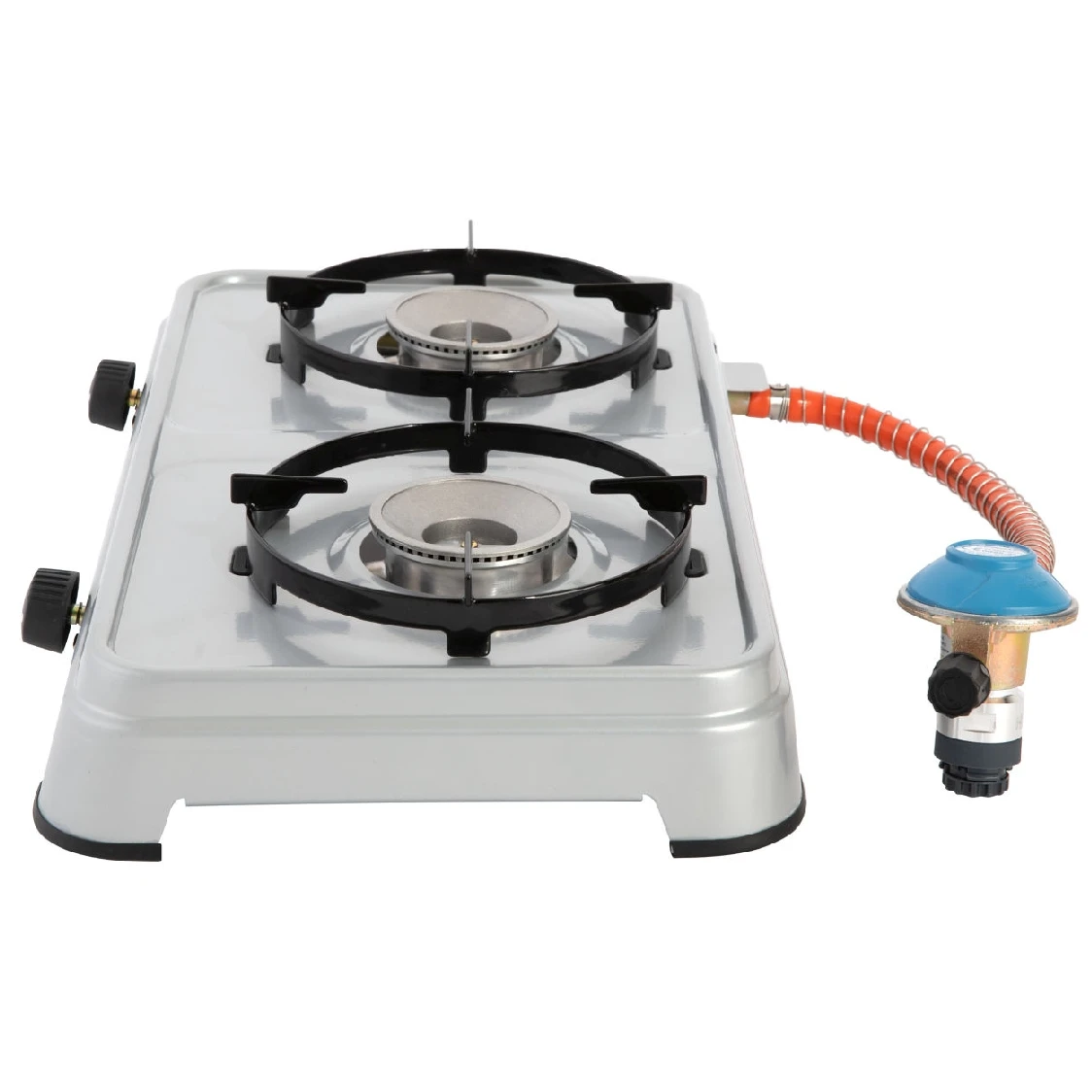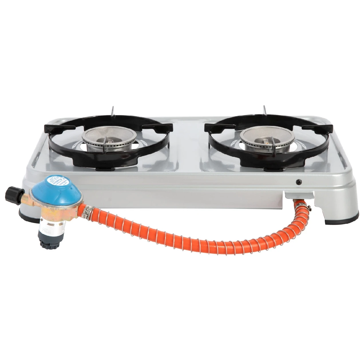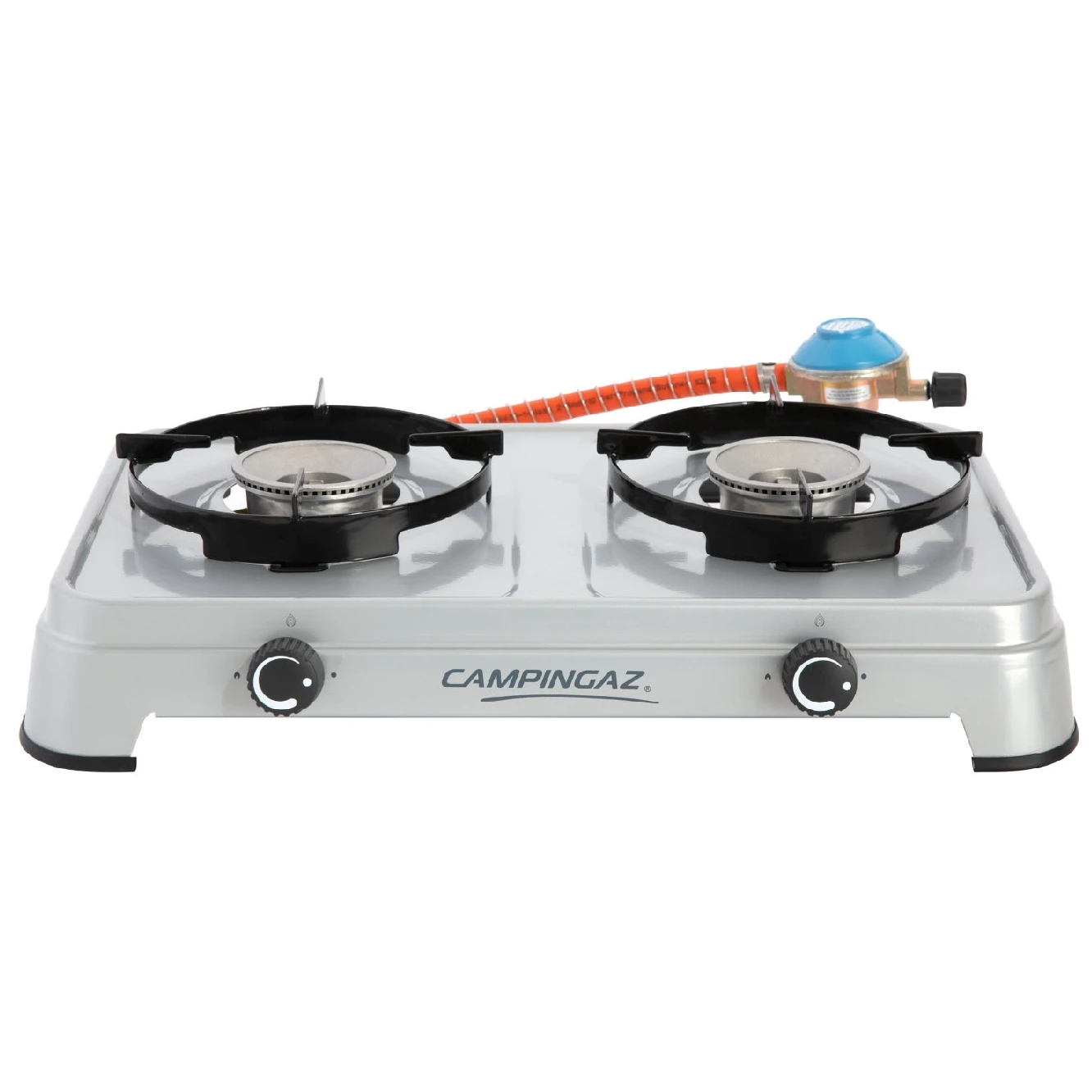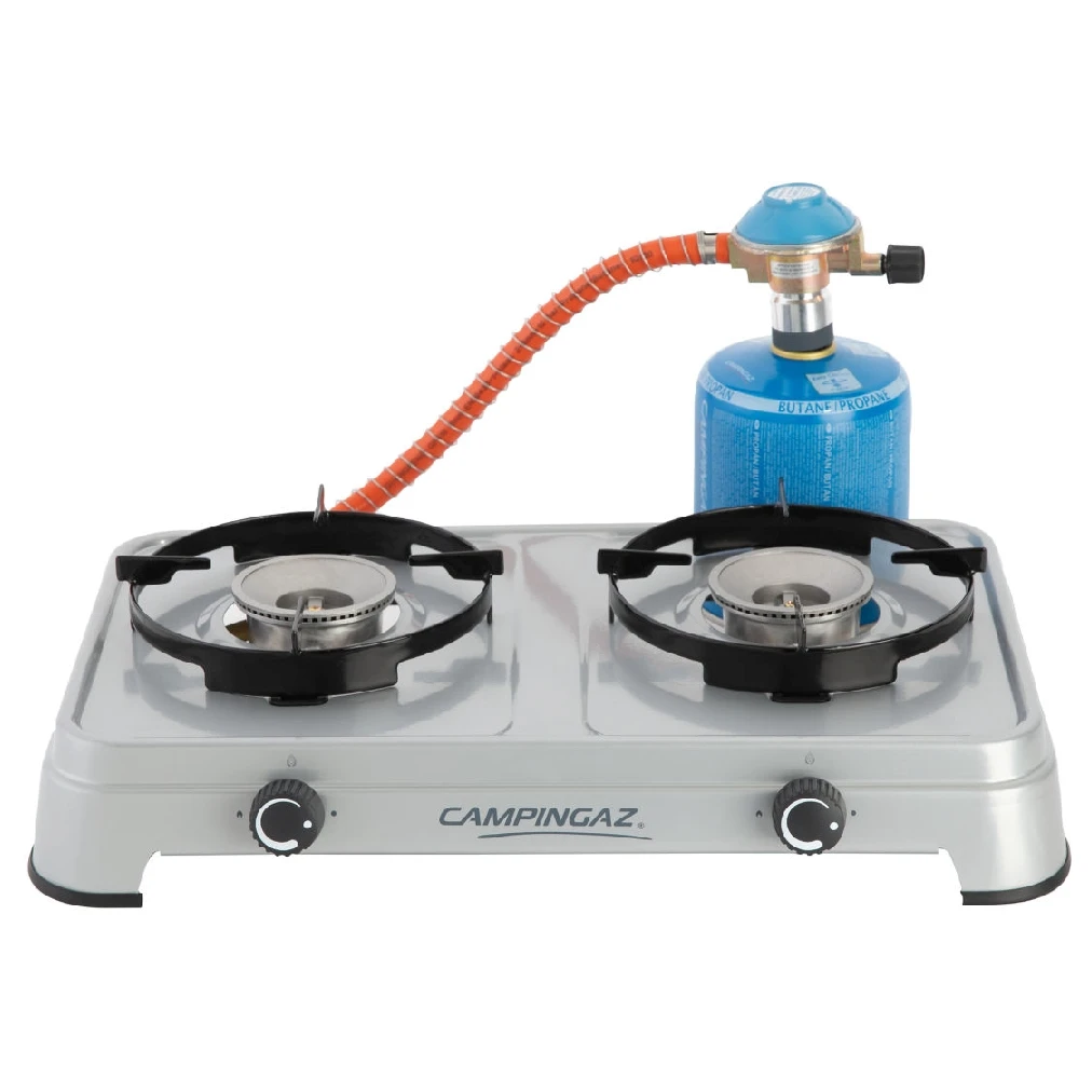 Zweiflammiger Campingkocher Campingaz Camping Cook CV auf Kartusche mit Anschlusssatz inklusive zur Verwendung mit Campingaz CV470-Kartuschen. Der Herd verfügt über gummierte Füße , was die Stabilität und Sicherheit beim Kochen erhöht. Zündung direkt in den Bedienknöpfen. Die emaillierten Topfträger lassen sich abnehmen und der Herd lässt sich bequem abwaschen.