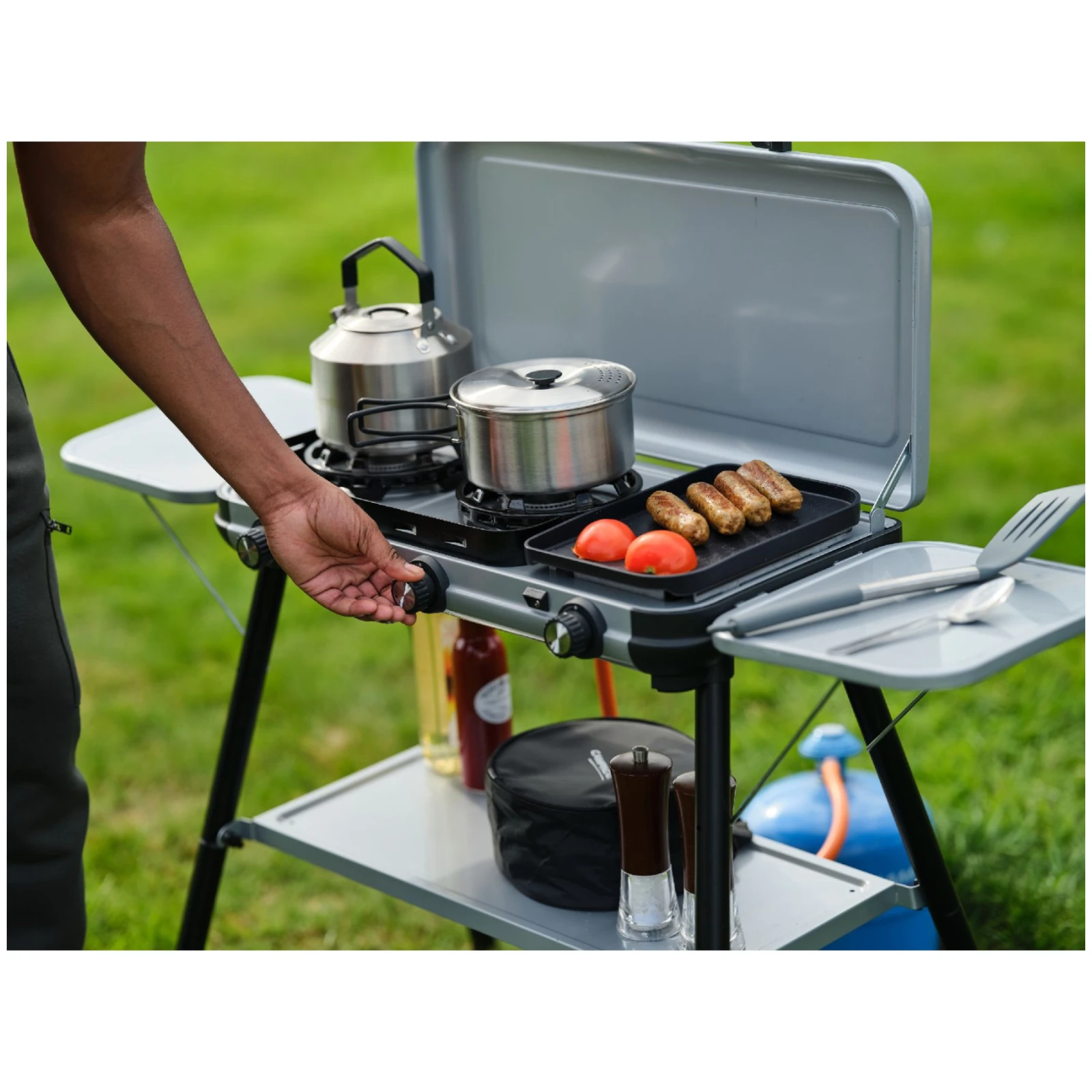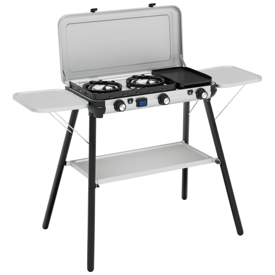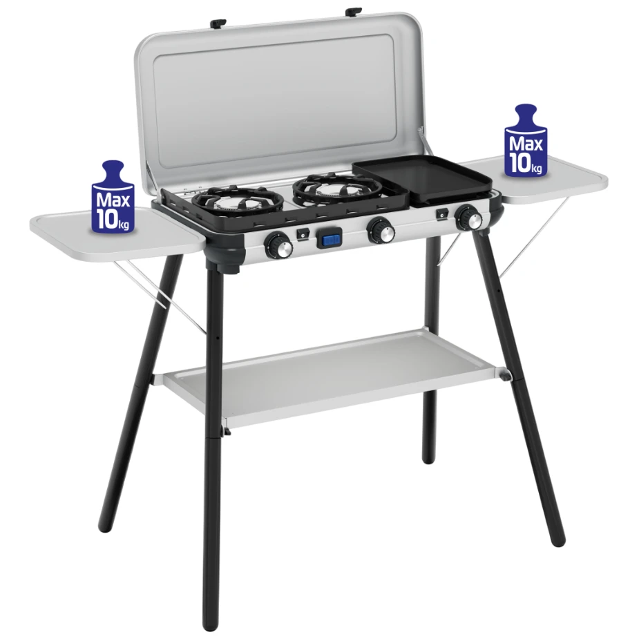 Der Campingkocher bietet 3 Brenner mit 2 Seitentischen und einem großen Stahlregal zur Aufbewahrung von weiterem Zubehör. Sie können gleichzeitig kochen, sautieren und toasten und so für ein schnelles und perfekt getimtes Servieren der Gerichte sorgen. Der Ofen bietet zwei Verwendungsmöglichkeiten: Er kann als leichter Tischgrill auf einem Tisch platziert werden. Wenn auf dem Tisch kein Platz ist, können die Stahlbeine, Seitentische und das Gewürzregal einfach angebracht werden und schon ist der Ofen bereit zum Grillen.