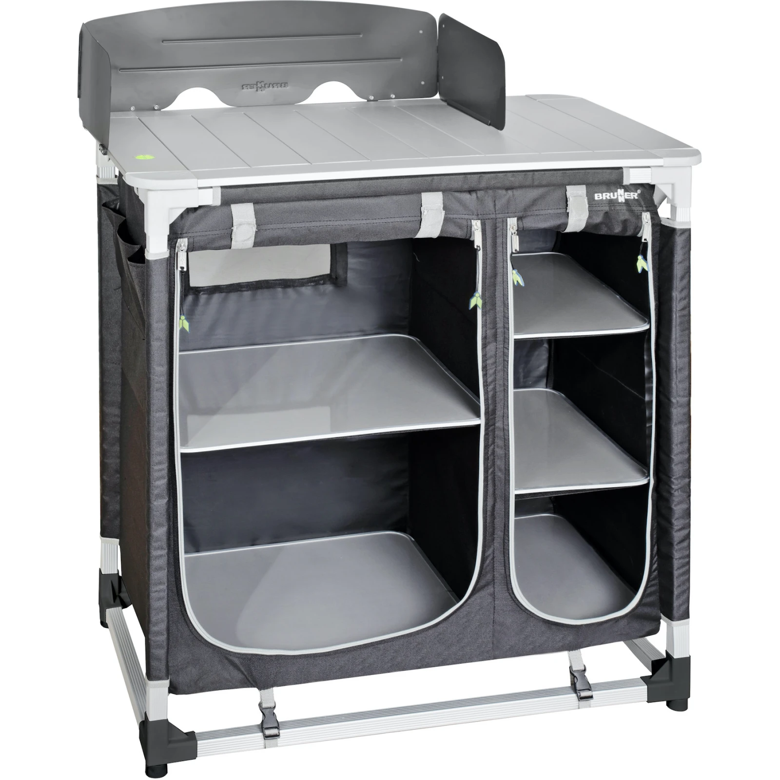 Der multifunktionale Camping- Schrank Azabache CT der Marke Brunner ist die perfekte Wahl zum Kochen und Aufbewahren. Hinter der Reißverschlusstür befinden sich insgesamt 5 Ablageflächen, auf denen Sie Ihre Sachen verstauen können. Zusätzlich können Sie die Aluminiumplatte mit integrierter Wasserwaage zur Ablage von Gegenständen nutzen. Um Sie beim Kochen vor windigem Wetter zu schützen, kann das Kochfeld mit einem Sichtschutz (im Lieferumfang enthalten) ergänzt werden.
