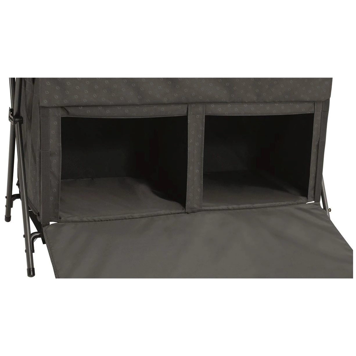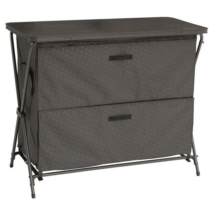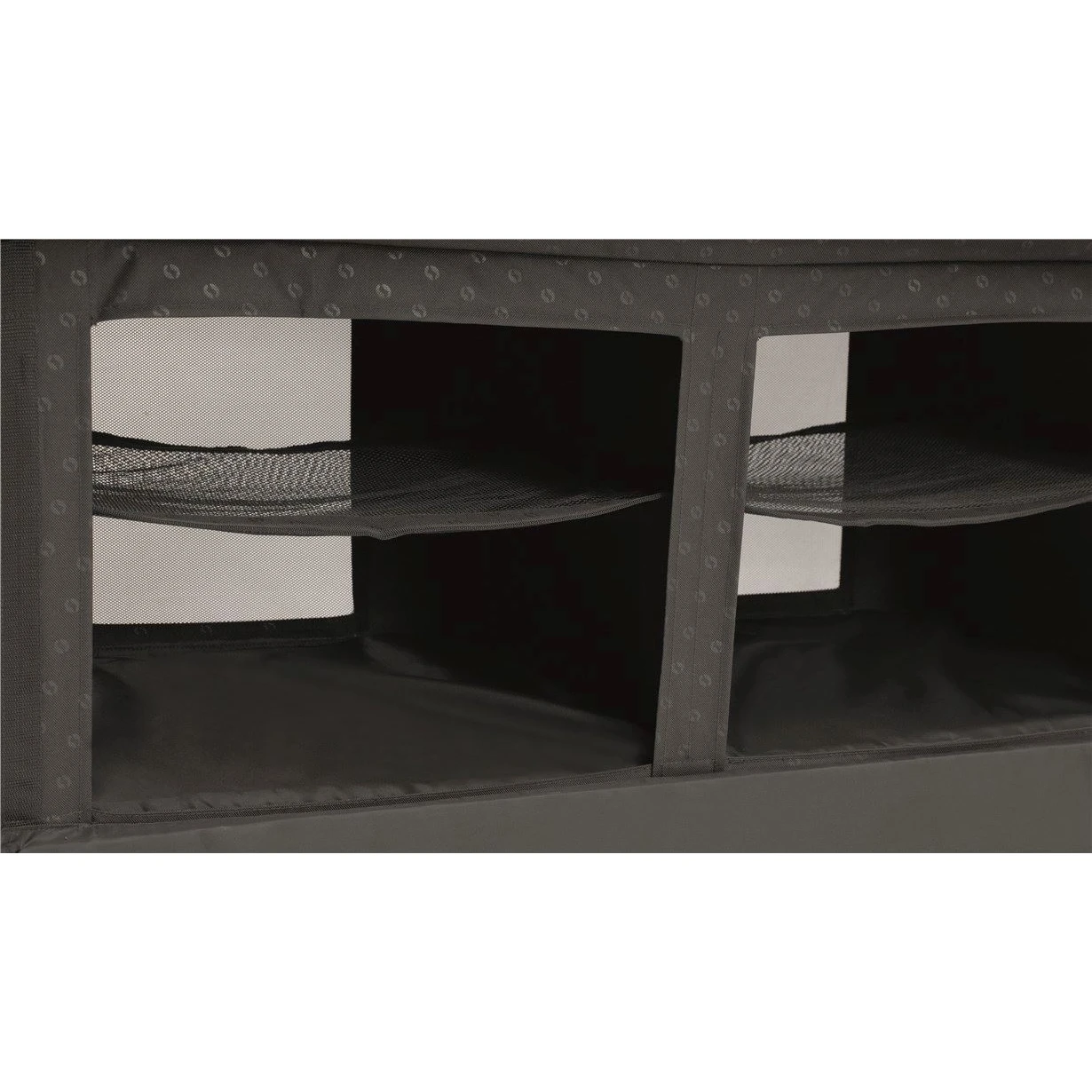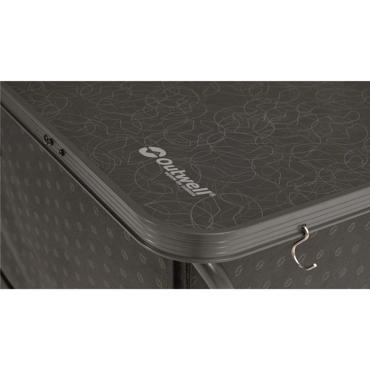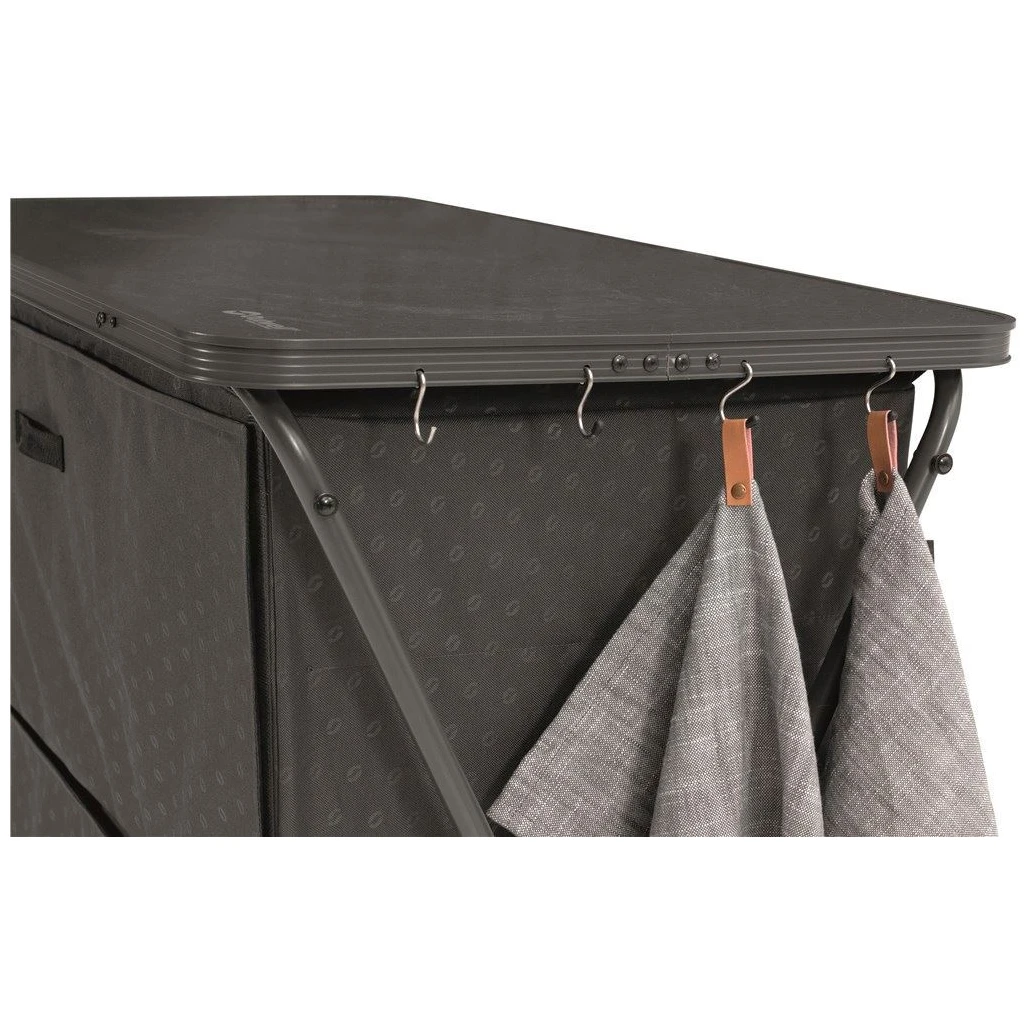 Der Aruba Cabinet Campingschrank des dänischen Outdoor-Herstellers Outwell verfügt über eine leichte und langlebige Aluminiumkonstruktion. Diese Struktur ist mit Polyestergewebe bespannt. Der Schrank verfügt über einen Stauraum mit separaten Türen mit Magnetöffnung. Hinter der Tür befinden sich insgesamt 6 Ablageflächen, welche an der Rückseite mit einem Mesh-Belüftungsloch ausgestattet sind. Außerdem können Sie Ihre Sachen in der praktischen Seitentasche verstauen oder an der anderen Seite an insgesamt 4 Haken aufhängen. Dank der massiven Laminatplatte kann der Schrank auch als Tisch zur Aufbewahrung von Dingen verwendet werden.