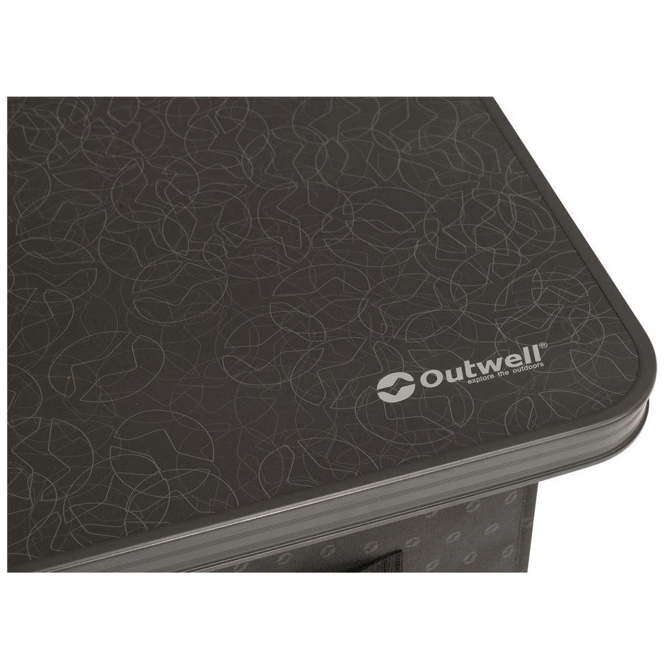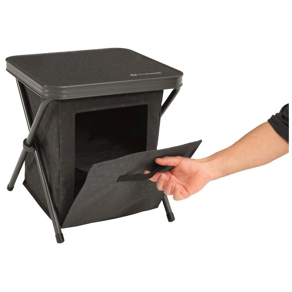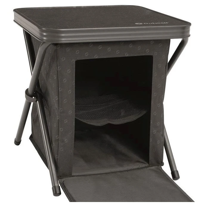 Der Cayon Cabinet Campingschrank des dänischen Outdoor-Herstellers Outwell ist aus leichtem und langlebigem Aluminium gefertigt. Diese Struktur ist mit Polyestergewebe bespannt und hat eine Tür mit Magnetverschluss. Hinter der Tür befinden sich 2 Ablageflächen, welche an der Rückseite mit einem Mesh-Belüftungsloch ausgestattet sind. Dank der massiven Laminatplatte kann der Schrank auch als Nachttisch verwendet werden.
