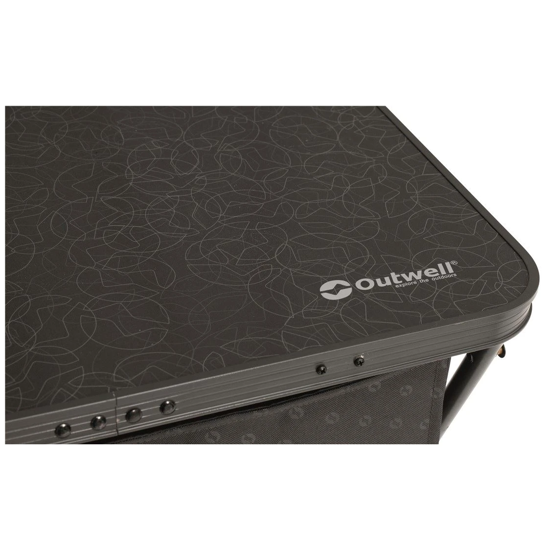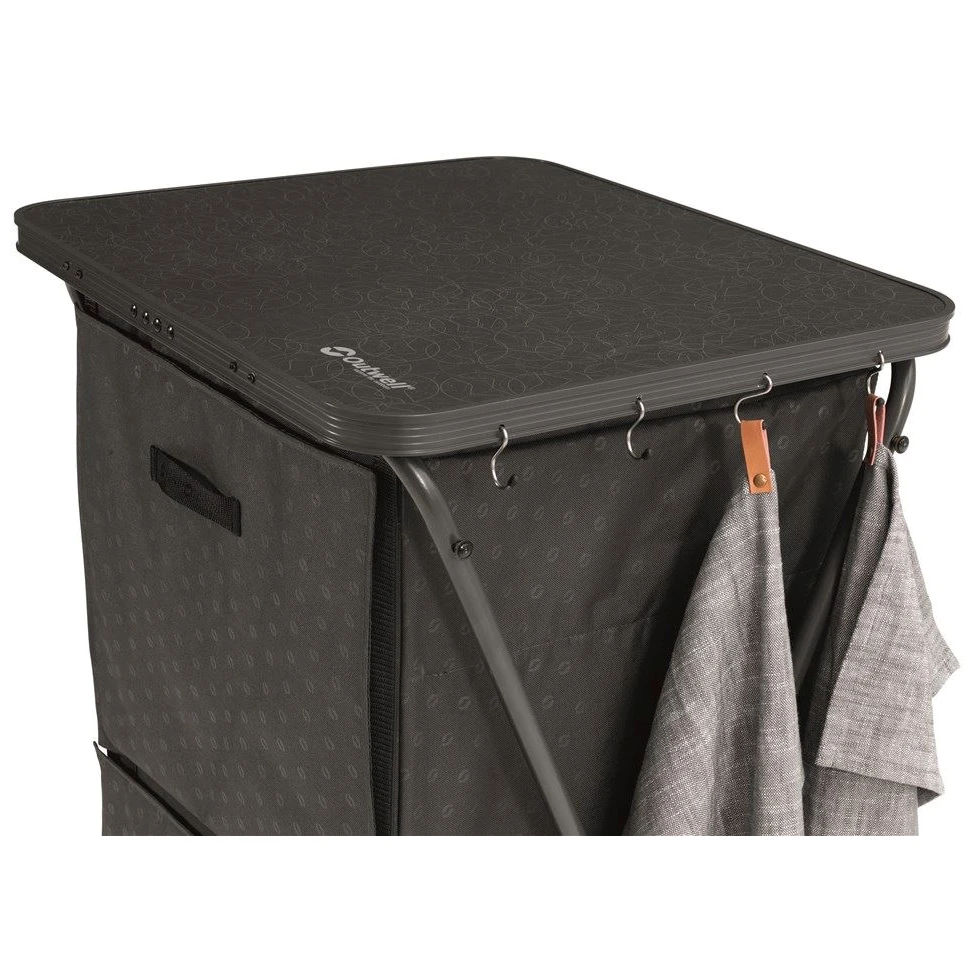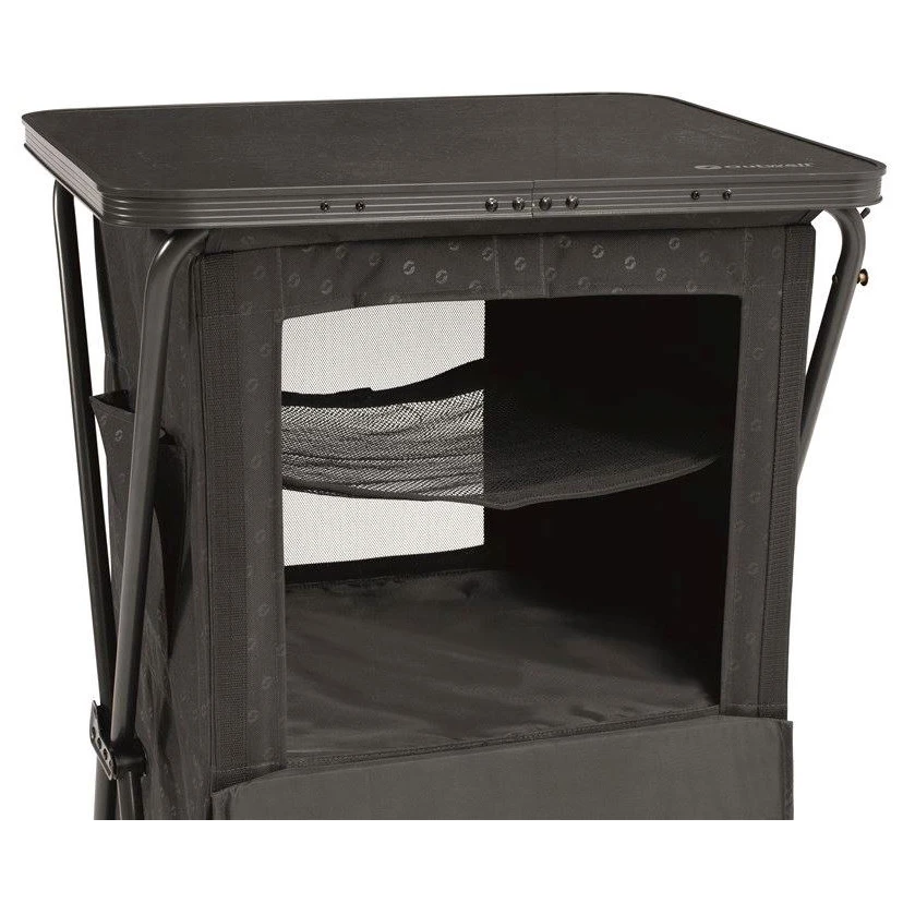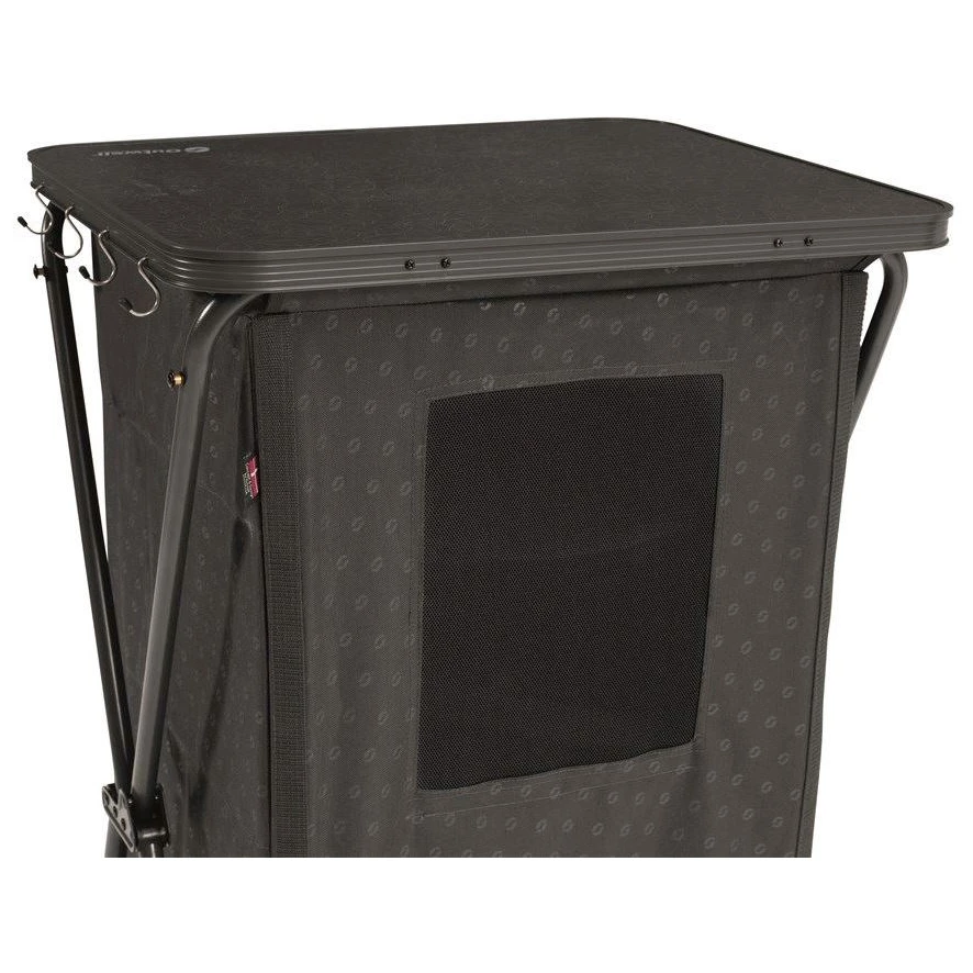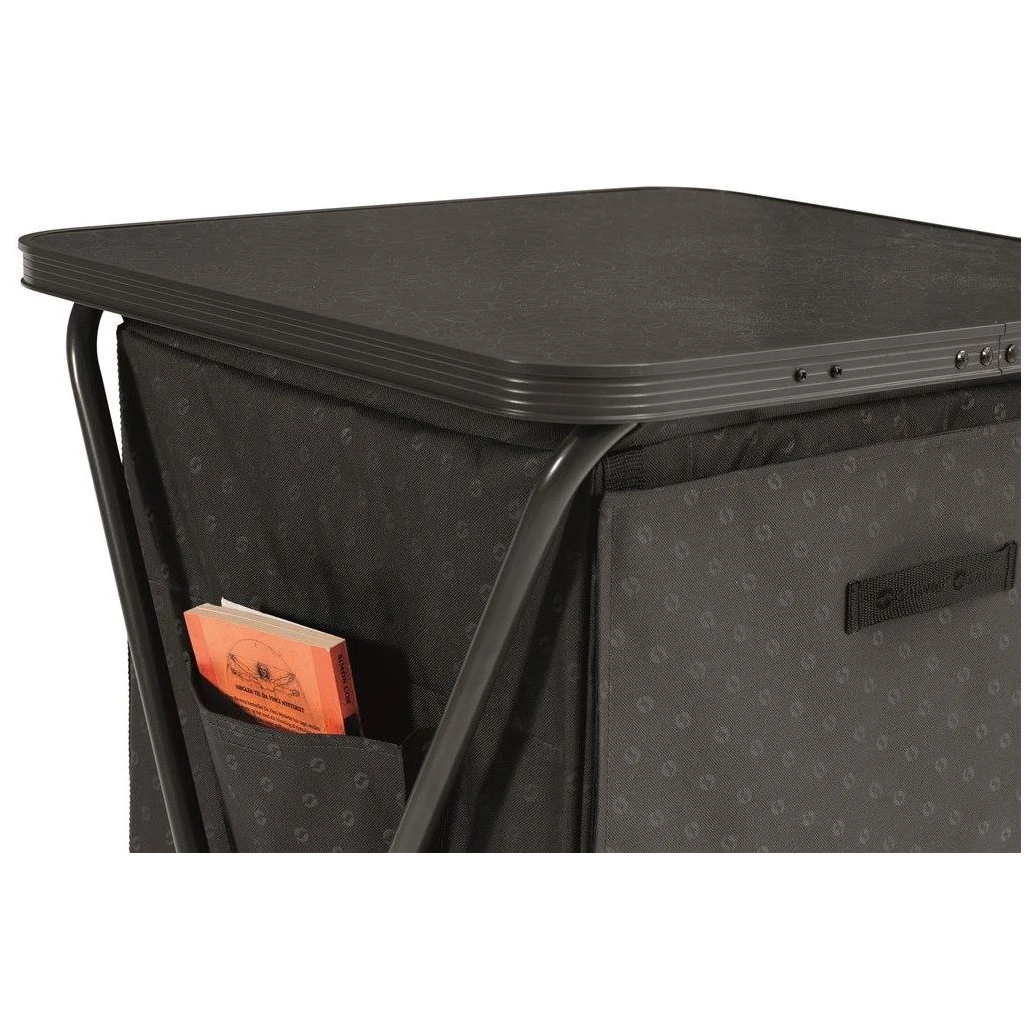 Der Domingo Cabinet Campingschrank des dänischen Outdoor-Herstellers Outwell ist aus leichtem und langlebigem Aluminium gefertigt. Diese Struktur ist mit Polyestergewebe bespannt. Der Schrank verfügt über einen Stauraum mit separaten Türen mit Magnetöffnung. Hinter der Tür befinden sich insgesamt 3 Ablageflächen, welche an der Rückseite mit einem Mesh-Belüftungsloch ausgestattet sind. Außerdem können Sie Ihre Sachen in der praktischen Seitentasche verstauen oder an der anderen Seite an insgesamt 4 Haken aufhängen. Dank der massiven Laminatplatte kann der Schrank auch als Tisch zur Aufbewahrung von Dingen verwendet werden.
