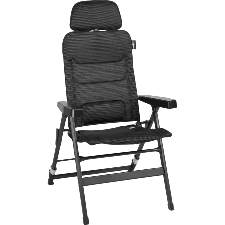 Der Stuhl ist aus leichtem und langlebigem Aluminium gefertigt. Der zuverlässige Klappmechanismus und das Mittelgelenk aus robustem Metall tragen zusätzlich zur hohen Langlebigkeit bei. Ergänzt wird der Rahmen durch den hoch atmungsaktiven und haptisch angenehmen Stoff 3Durafeel, der in Kombination mit der Polsterung ein angenehmes Sitzgefühl garantiert. Zudem ist das dreilagige Gewebe schmutzabweisend, reiß- und abriebfest. Bequemes Tragen und Aufbewahren wird durch die klappbaren Kopfstützen und das Klappteil an den Hinterbeinen gewährleistet. Dank dieser Klappteile ergeben sich kompakte Abmessungen, wodurch der Stuhl auch in kleinere Autos passt.