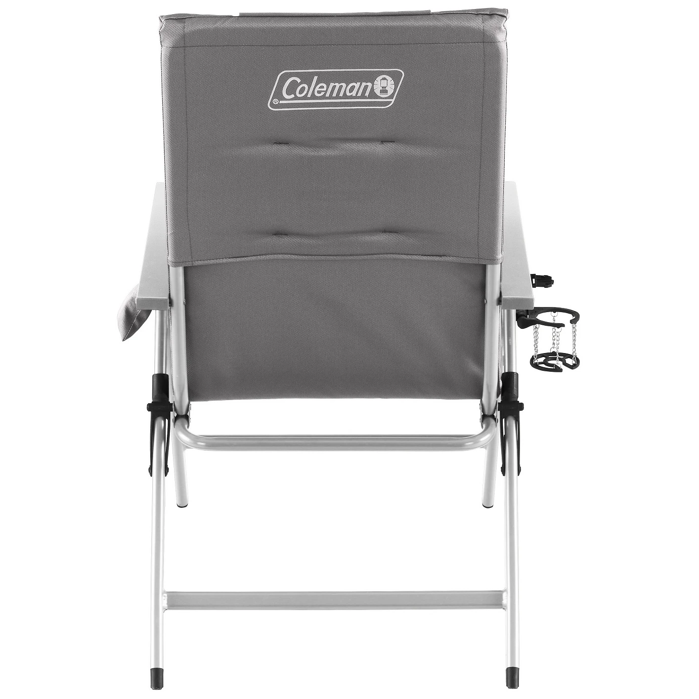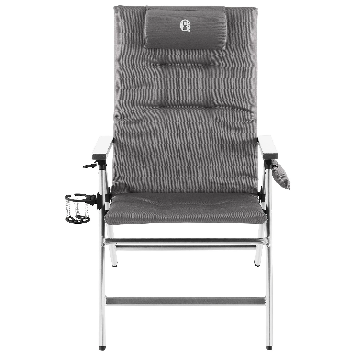 Der bequeme Stuhl mit 5-fach verstellbarer Rückenlehnenneigung und gepolstertem Aluminium der Marke Coleman ist robust und bequem mit einer Aluminiumkonstruktion und 5-facher Verstellung. Inklusive faltbarem Getränkehalter und gepolsterter Kopfstütze.
