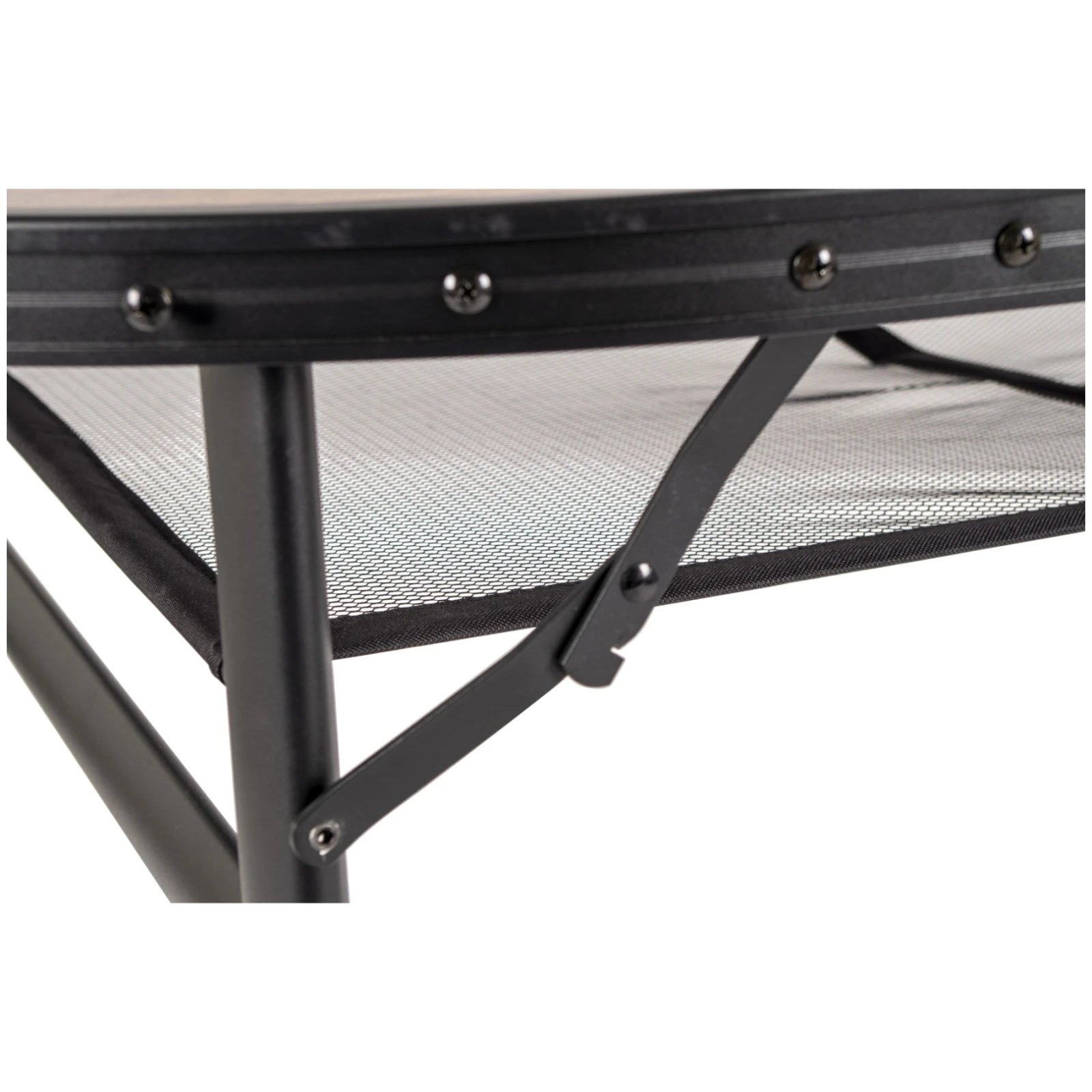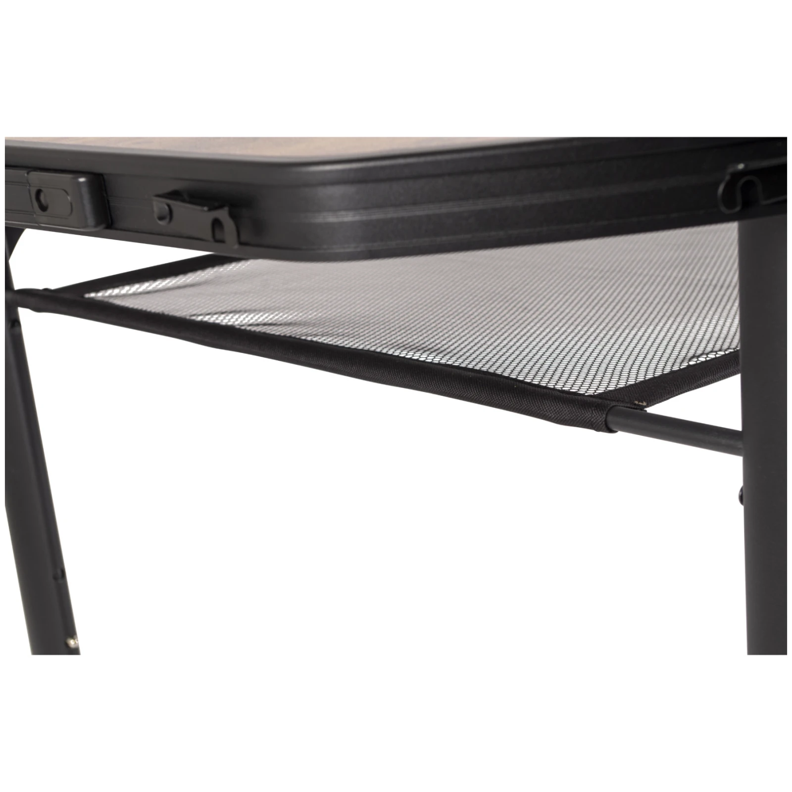 Der stilvolle Aluminiumtisch Bo-Camp Woodbine besticht durch seinen industriellen Look und die Tischplatte in Holzoptik. Durch Justierungsschrauben können die Tischbeine an unebene Flächen angepasst werden. Die Beine sind in 3 verschiedenen Höhen verstellbar (55/65/70 cm). Darüber hinaus lässt sich der Tisch dank der abnehmbaren Beine und der teilbaren Platte sehr kompakt als Koffer-Modell verstauen.
