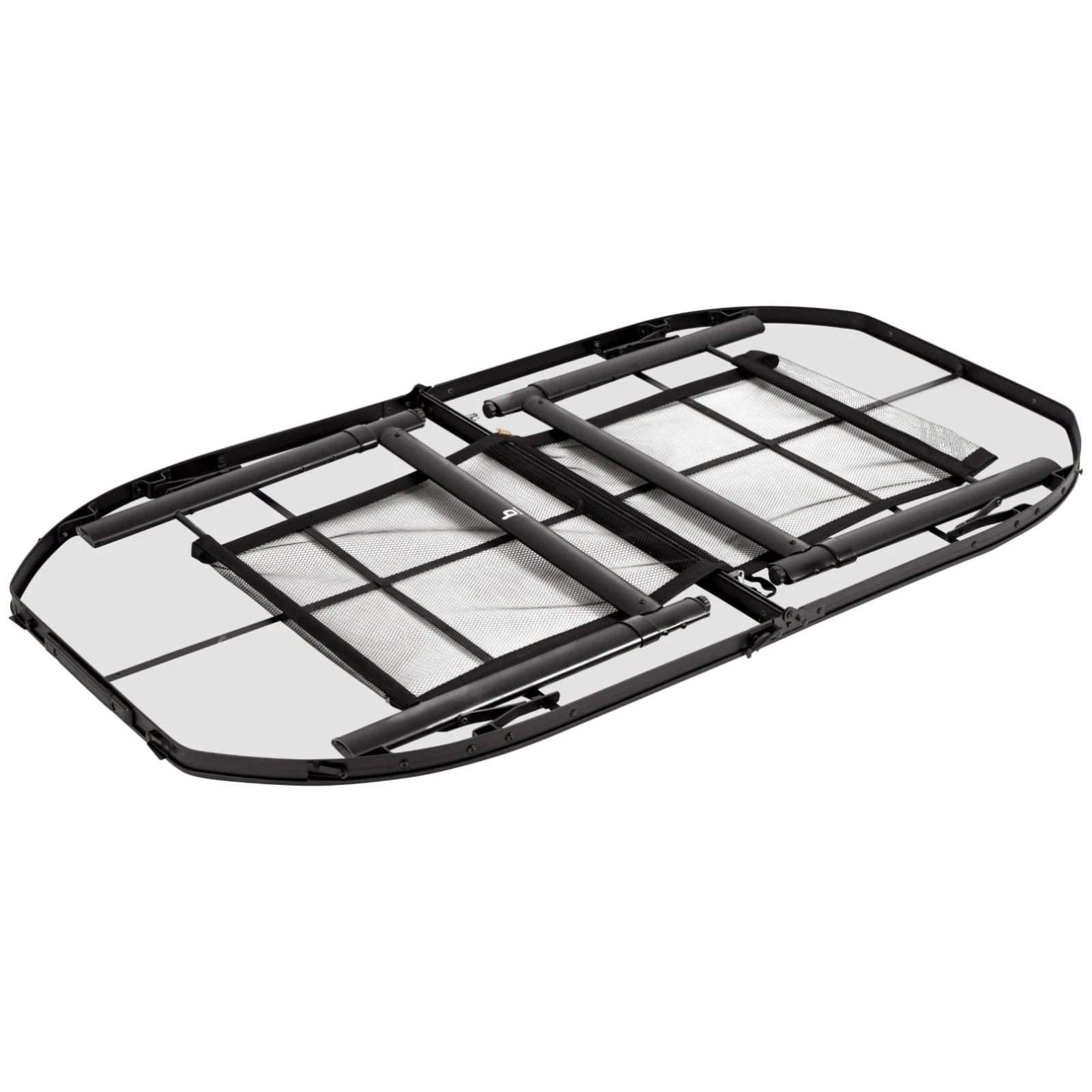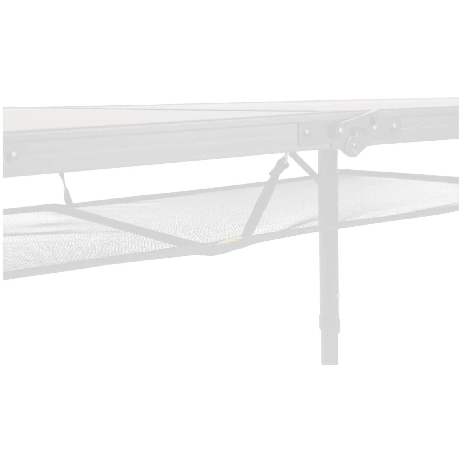 Der Tisch ist mit einem Netz unter der MDF-Platte zur Aufbewahrung von Gegenständen und einem Griff ausgestattet, der den Transport erleichtert. Zusammengeklappt (L x B x H): 80 x 7 x 75,5 cm.