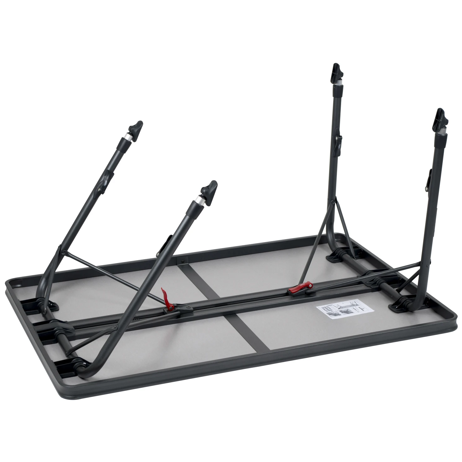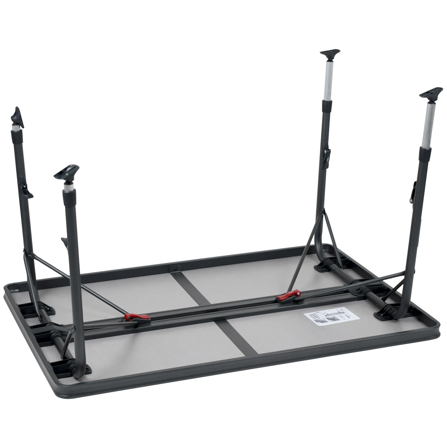 Aluminium-Lamellen an der Unterseite dieses Campingtisches sorgen zudem für zusätzliche Verstärkung. Hochwertige Materialien und eine hitzebeständige und wasserfeste Tischplatte sorgen für eine lange Lebensdauer. Die Beine bieten hohe Stabilität dank dicker (28 mm) und extra verstärkter Rohre. Stabilisierungsfüße sorgen für zusätzlichen Halt auf jedem Untergrund.