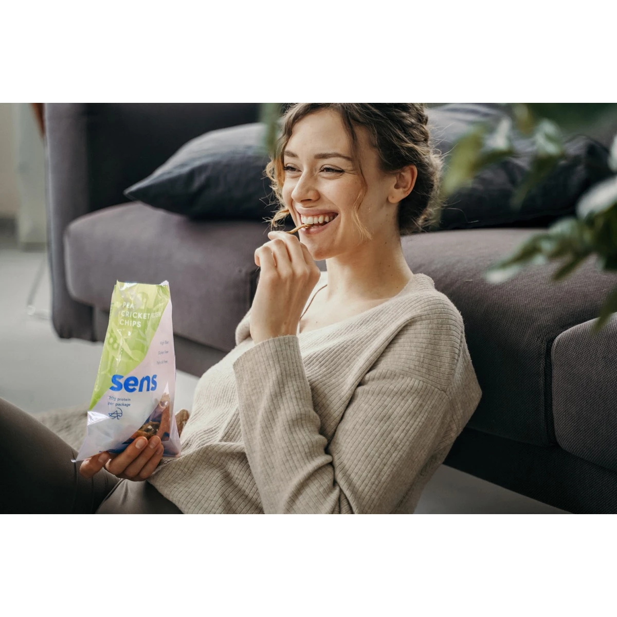 SENS Erbsenchips mit Grillenprotein sind ein salziger Snack zum Fernsehen, für die Arbeit oder unterwegs. Der gesunde Snack enthält 20g hochwertiges Protein.