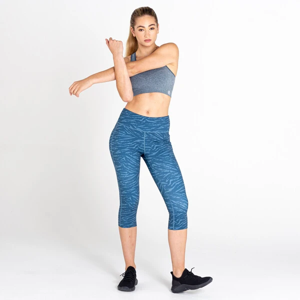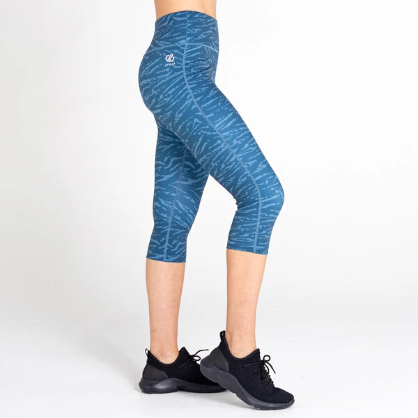 Funktionale 3/4-Leggings für Damen Influential 3/4 der Marke Dare 2b bestehen aus recyceltem, leichtem Stoff Q-Wic Soft-Touch-Polyester, der Feuchtigkeit und Schweiß effektiv von der Haut ableitet und zudem schnell trocknet und hockefest ist. Die Leggings haben einen engen und glatten Schnitt, einen weichen elastischen Bund, flache Nähte für mehr Komfort und eine versteckte Tasche für Schlüssel oder Karten. Sie sind die ideale Wahl für Sport, Training und zum Faulenzen auf der Couch.