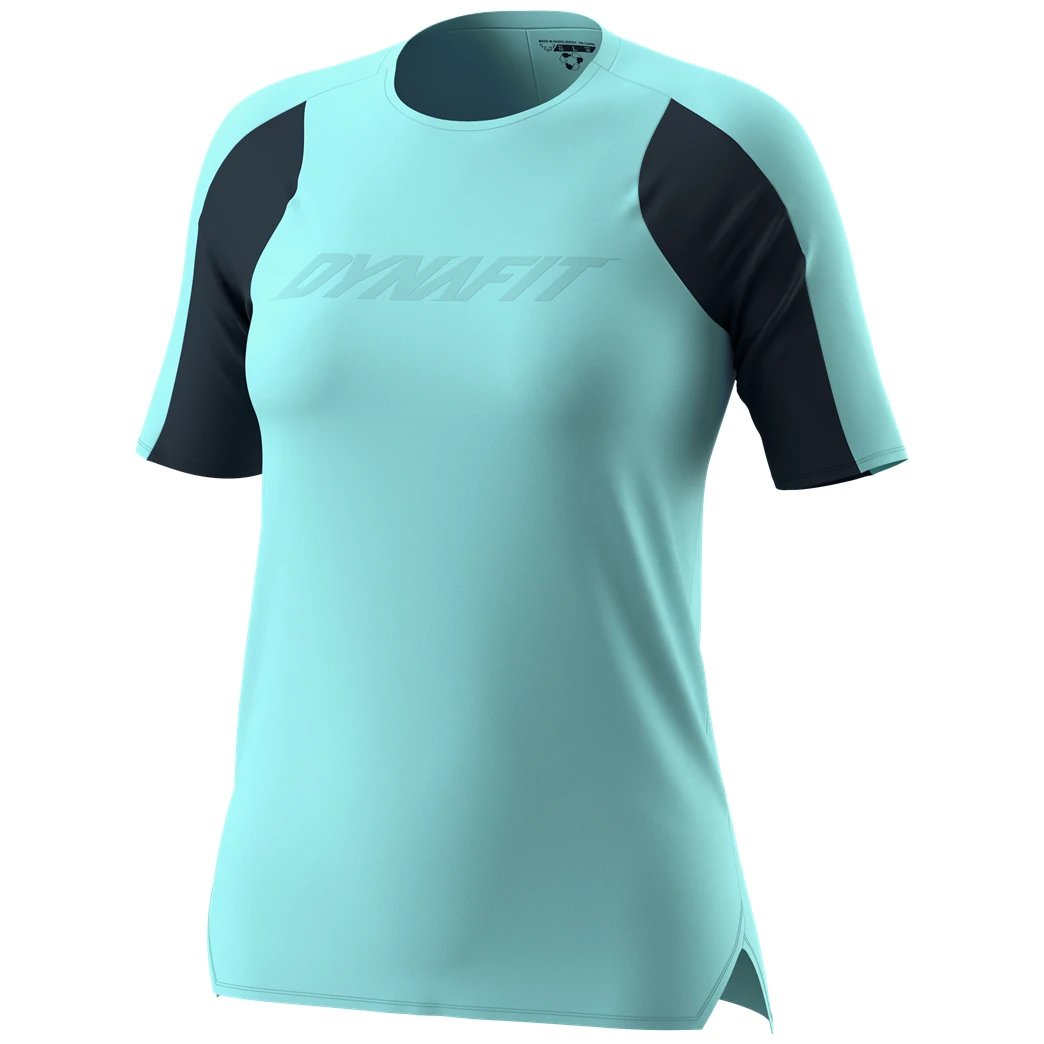 Das Rad-T-Shirt RIDE S/S TEE W Dynafit überzeugt durch seinen entspannten Schnitt, das recycelte Material aus einer Kombination aus Polyester und Elasthan, die HeiQ Fresch Anti-Geruchs-Behandlung und reflektierende Elemente.