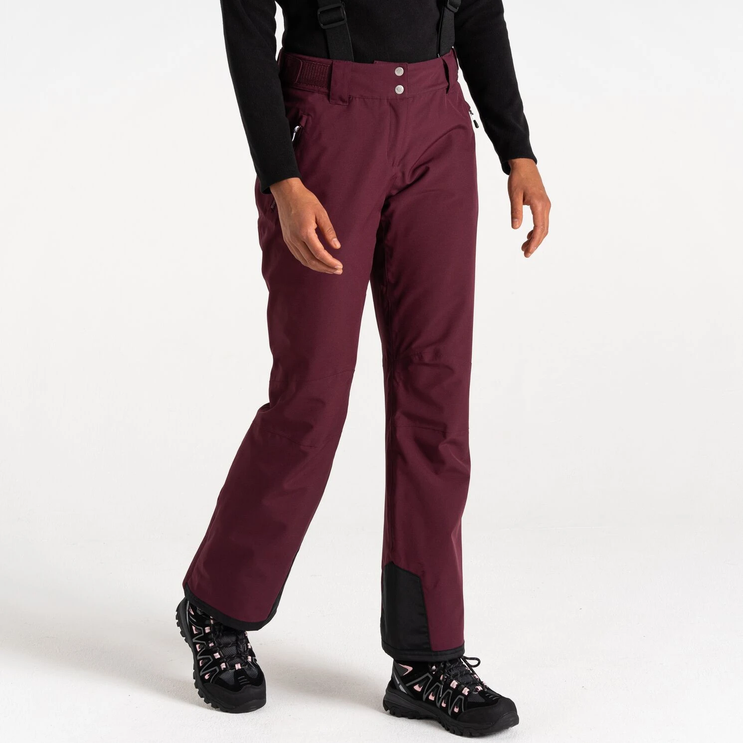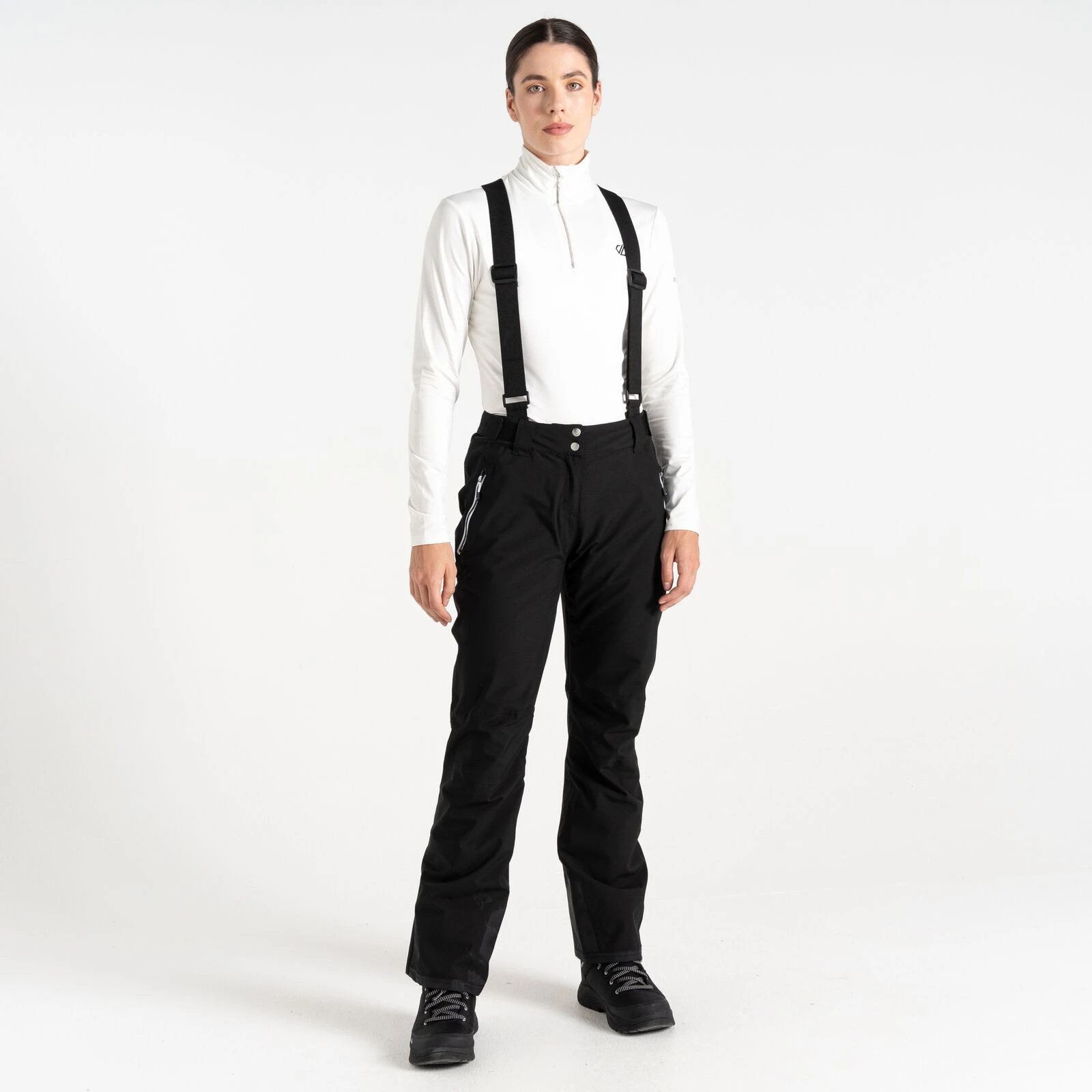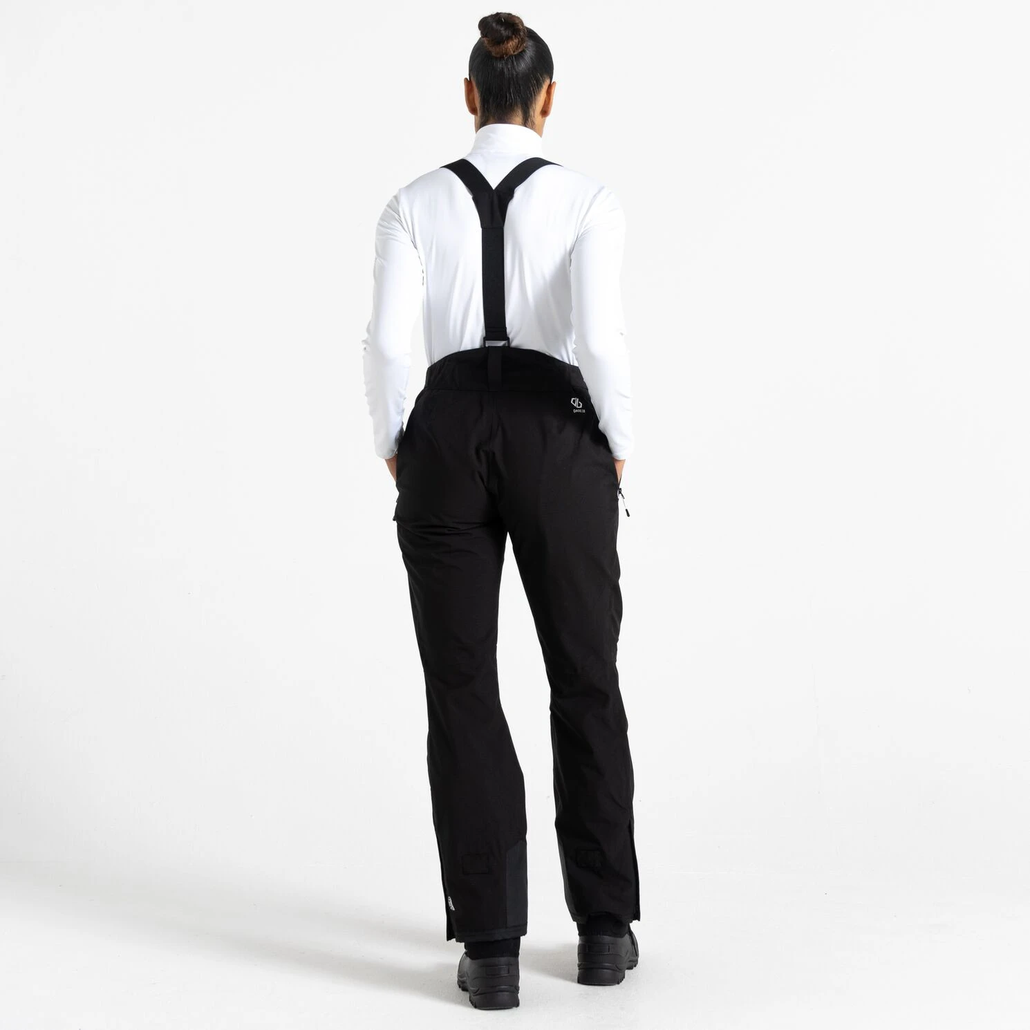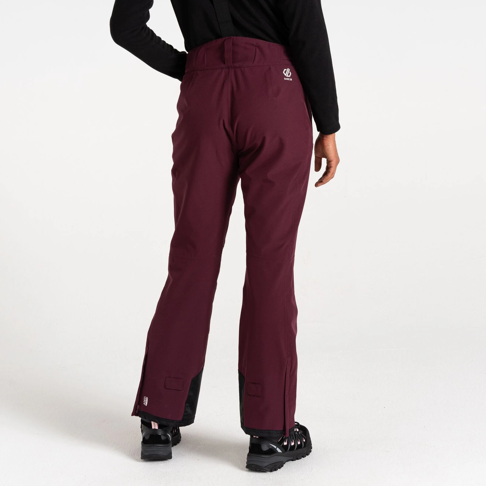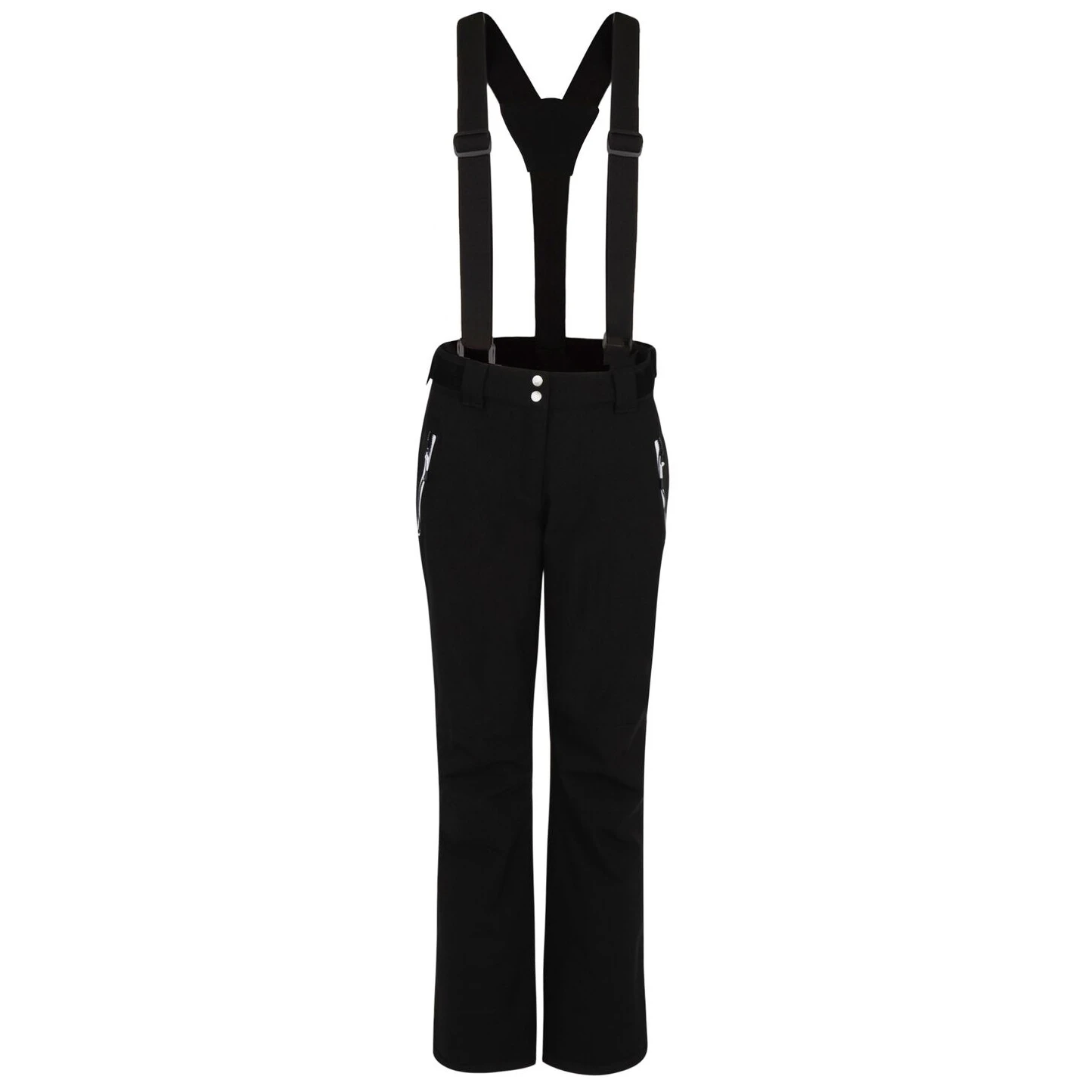 Die Damen-Skihose Diminish Pant von Dare 2b bietet einen klassischen Verschluss, verstellbare und abnehmbare Hosenträger sowie die Möglichkeit, die Bundweite per Klettverschluss individuell anzupassen. Vorgeformte Knie sorgen für mehr Bewegungsfreiheit. Verschweißte Nähte und die wasserabweisende Oberflächenbehandlung des Materials verhindern, dass Feuchtigkeit in das Material eindringt. Die Hose ist im Knöchelbereich mit verstärktem Material ausgestattet, außerdem befinden sich im Inneren der Hose Schneebündchen. Der seitliche Reißverschluss an den Beinen erleichtert das Anziehen der Skischuhe.