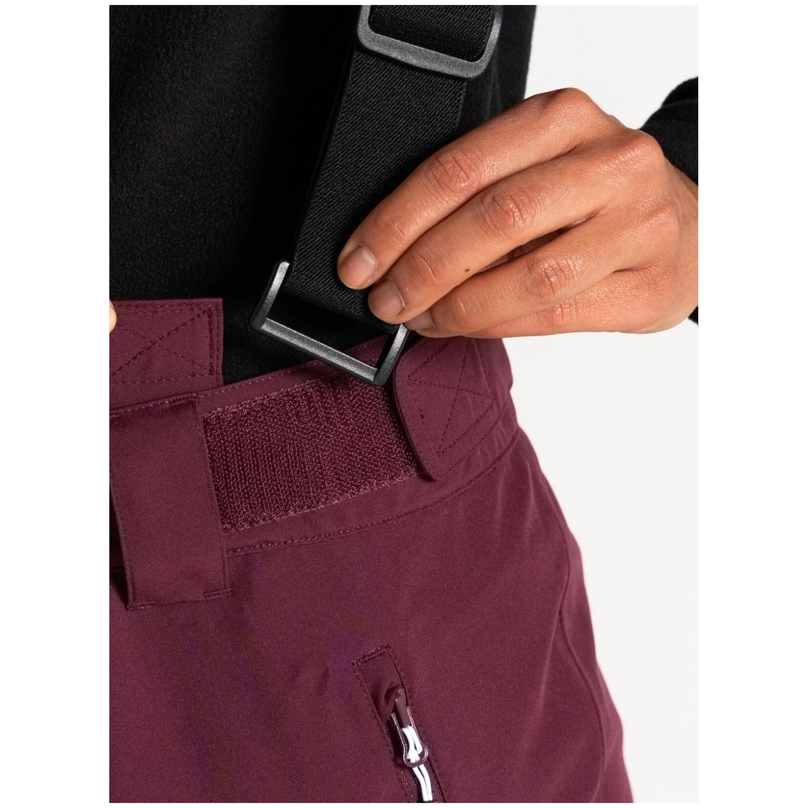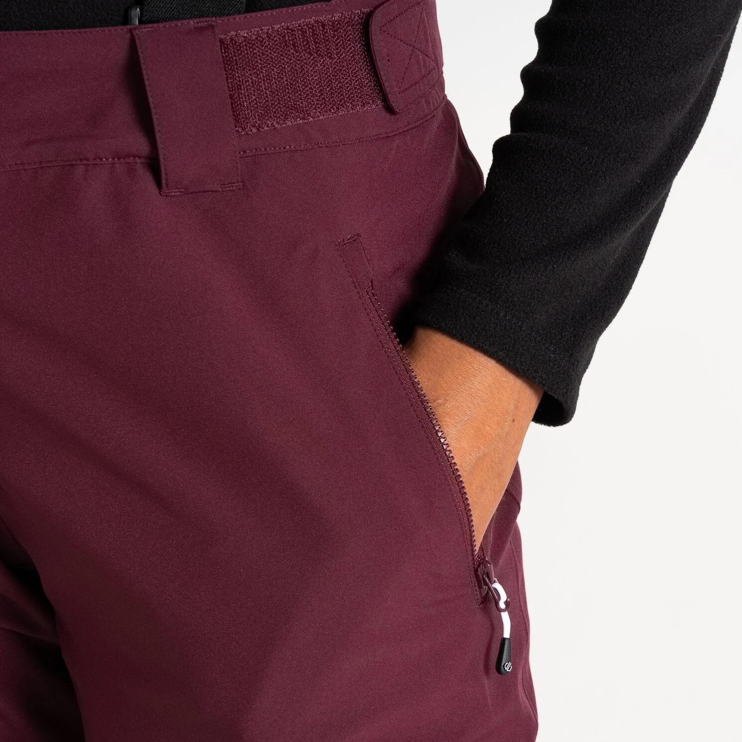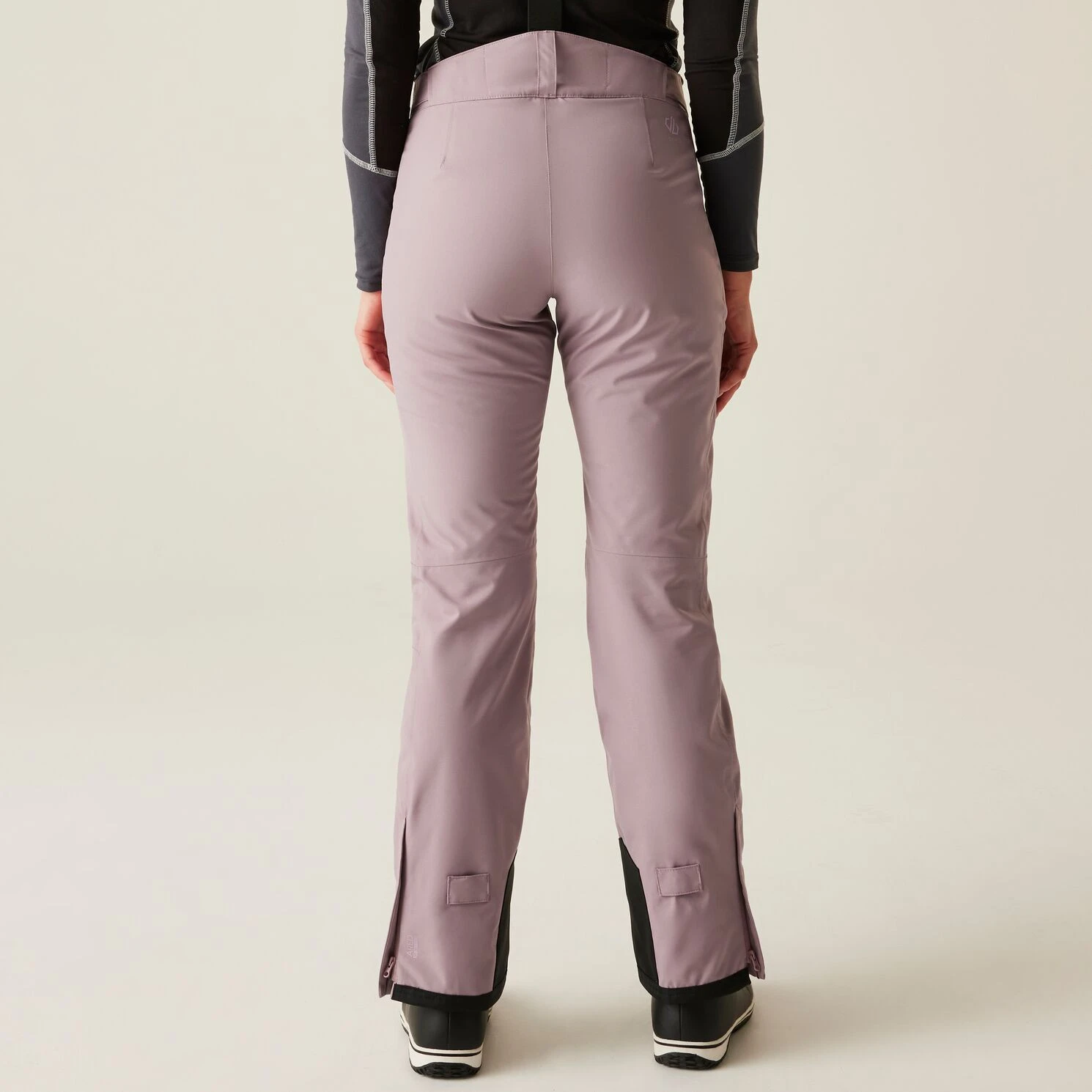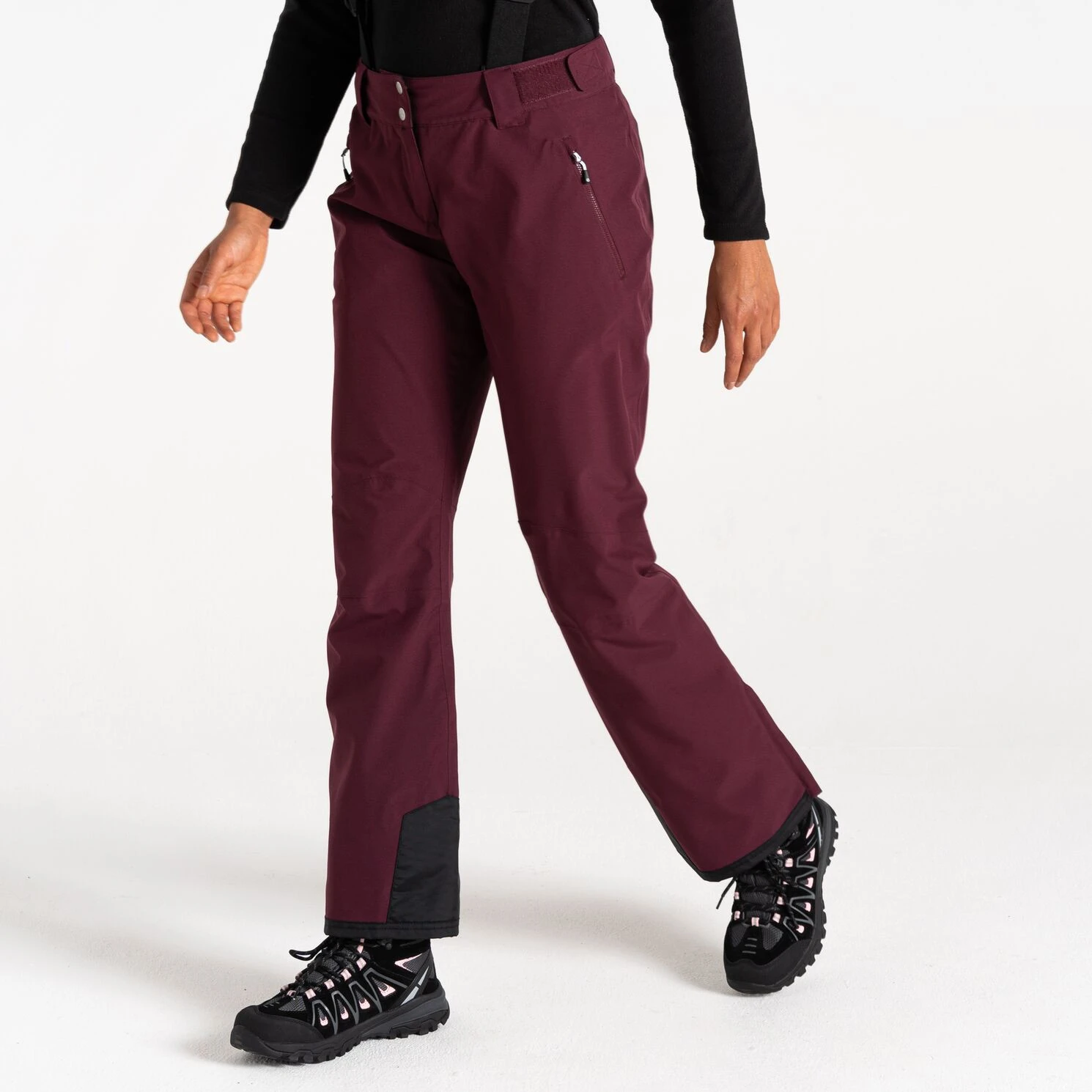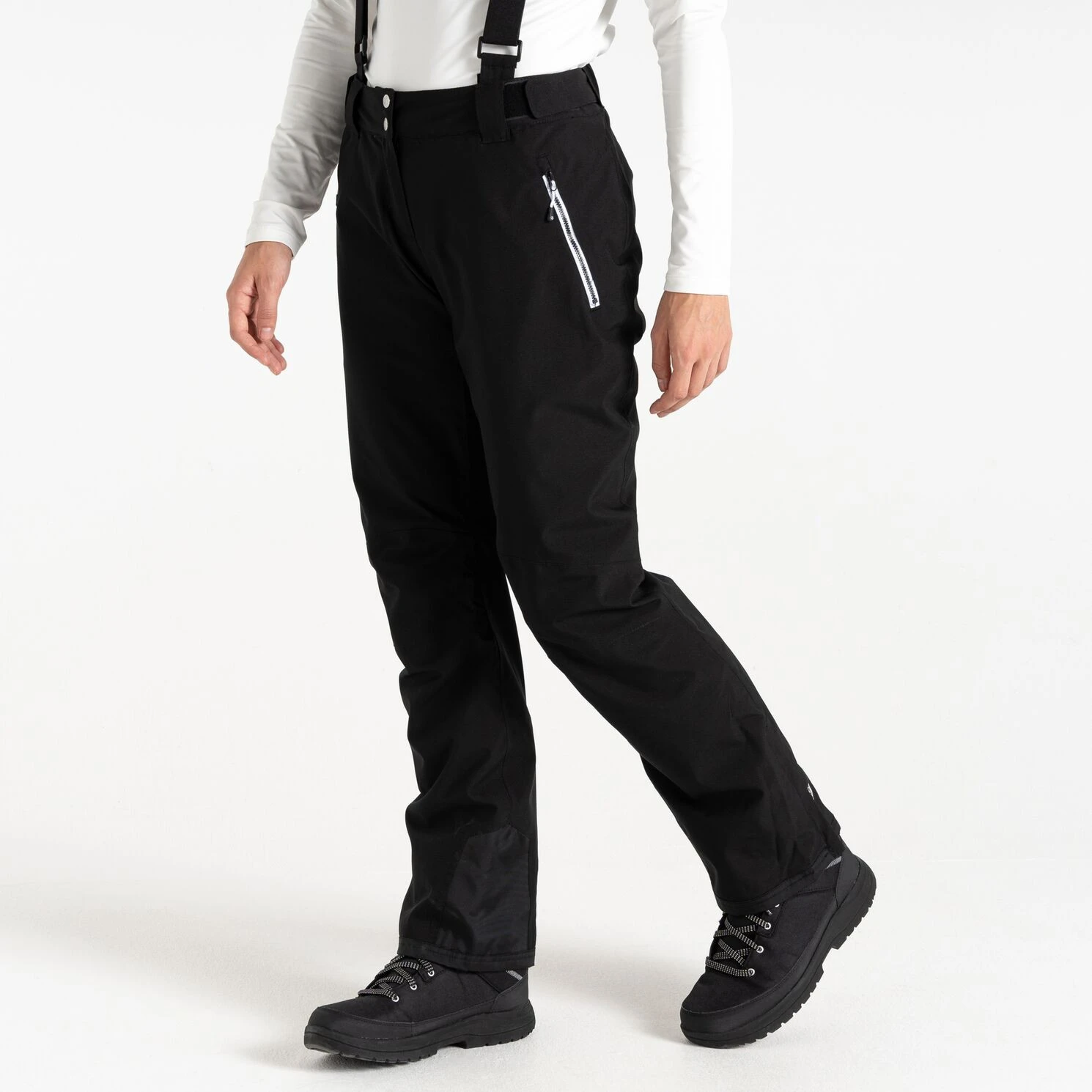 Die Damen-Skihose Diminish Pant von Dare 2b bietet einen klassischen Verschluss, verstellbare und abnehmbare Hosenträger sowie die Möglichkeit, die Bundweite per Klettverschluss individuell anzupassen. Vorgeformte Knie sorgen für mehr Bewegungsfreiheit. Verschweißte Nähte und die wasserabweisende Oberflächenbehandlung des Materials verhindern, dass Feuchtigkeit in das Material eindringt. Die Hose ist im Knöchelbereich mit verstärktem Material ausgestattet, außerdem befinden sich im Inneren der Hose Schneebündchen. Der seitliche Reißverschluss an den Beinen erleichtert das Anziehen der Skischuhe.