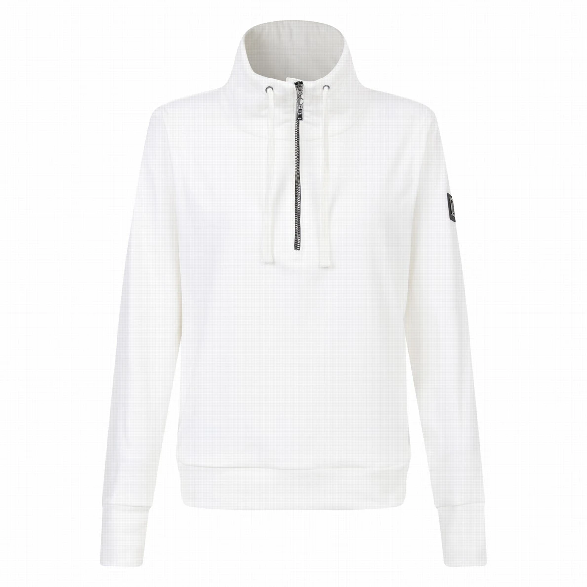 Es besteht aus weichem, gekämmtem Jerseystoff, der sehr warm ist. Ein kurzer 1/4-Reißverschluss mit Metallic-Effekt wird durch Kordelzüge ergänzt. Der höhere Kragen bietet guten Schutz bei schlechtem Wetter. Das Abzeichen, die Druckknöpfe und die Rückseite in der Mitte sind mit Swarovski-Kristallenverziert.