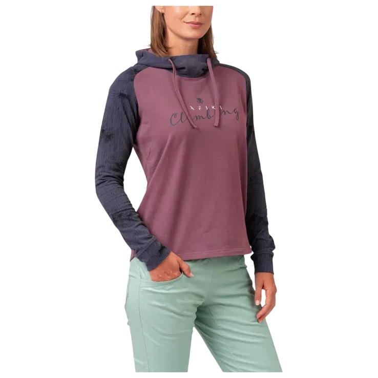 Leichtes und atmungsaktives Damen Sweatshirt Rafiki Estrella aus Bio-Baumwolle, in das du problemlos hineinklettern kannst. Durch den Elasthananteil ist es ausreichend dehnbar. Es eignet sich hervorragend zum Aufwärmen oder Aufwärmen nach dem Klettern. Es kann buchstäblich überall getragen werden: beim Felsklettern, Bouldern oder zur Yogastunde. Die kontrastfarbene Kapuze und die Kordelzüge machen das Sweatshirt zu einem auf jeden Fall interessanten Teil.