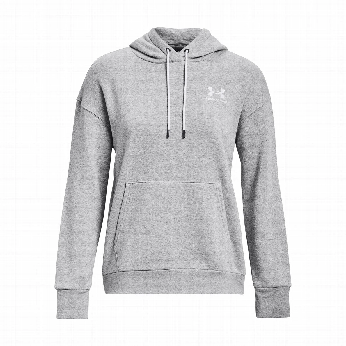 Women's Essential Fleece Hoodie der Marke Under Armour ist extra weich für vielfältige Einsatzmöglichkeiten. Mittelschweres Fleecegewebe mit hohem Baumwollanteil und angerauter Innenseite sorgt für noch mehr Wärme. Sehr schön ist die verstellbare Kapuze mit überkreuztem Kragen. Vordere Kängurutasche für kleine Gegenstände. Das Sweatshirt hat gerippte Bündchen und einen gerippten Saum.