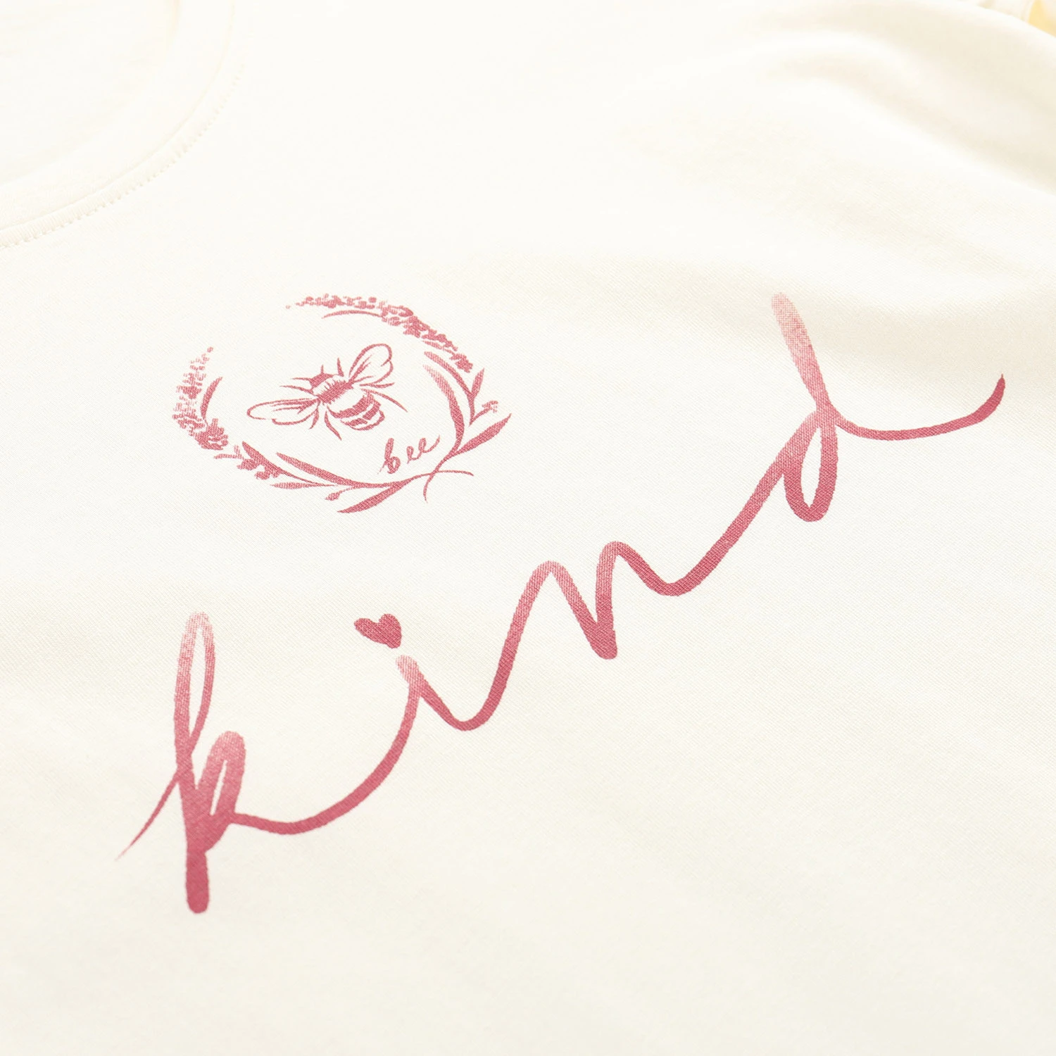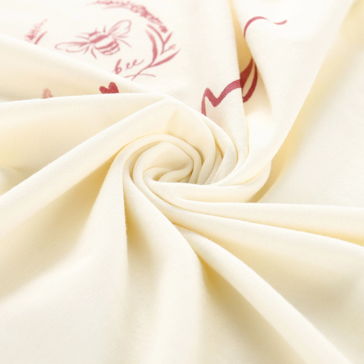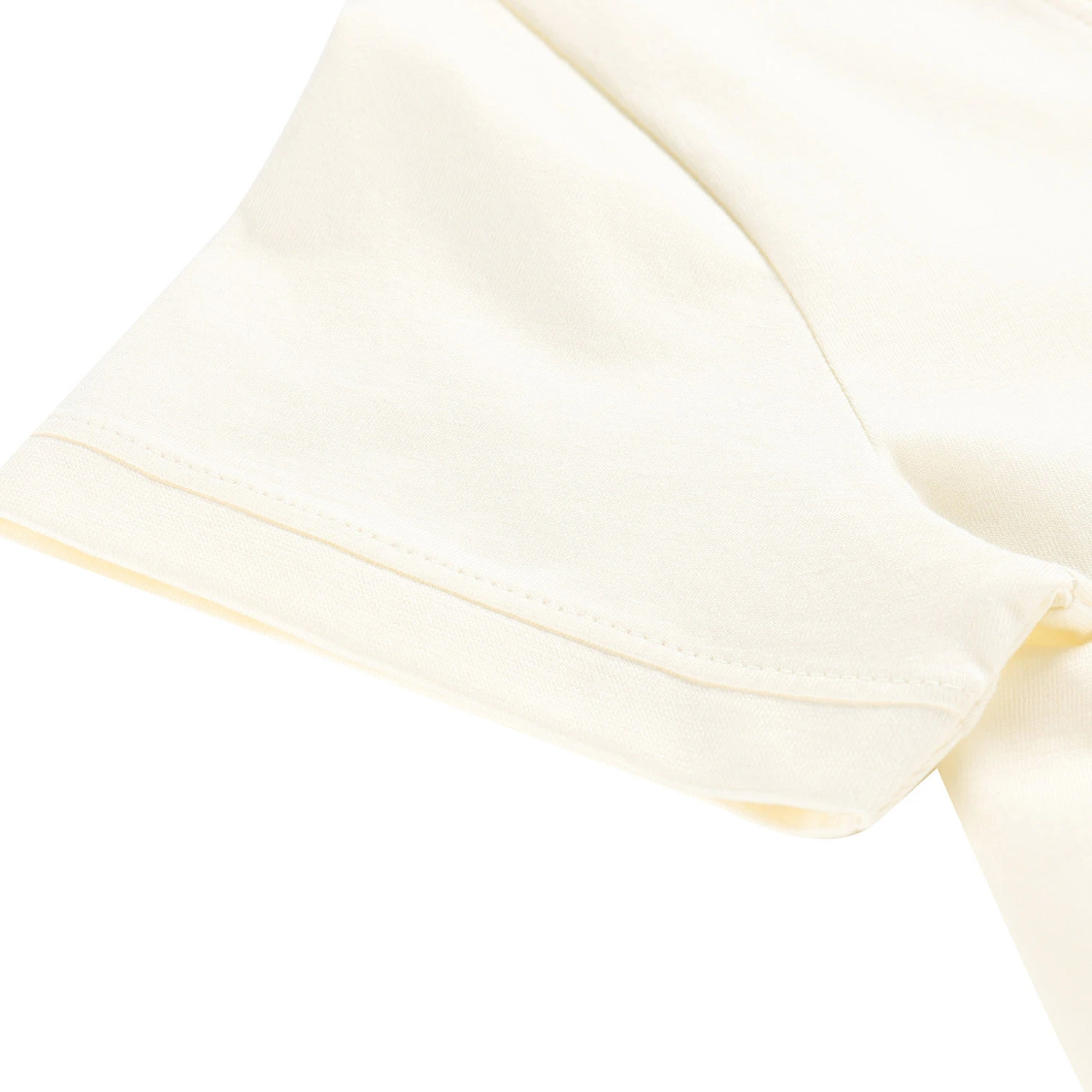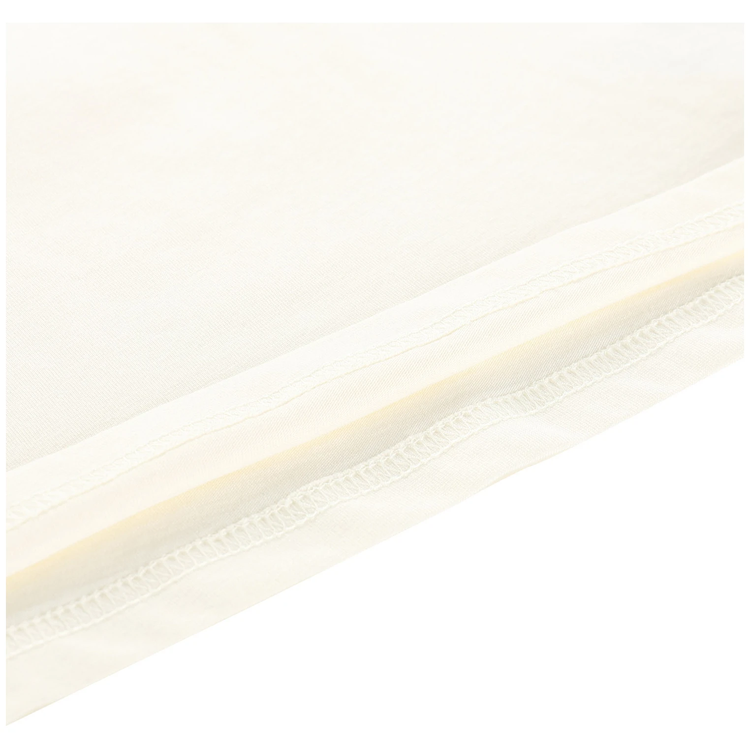 Auf der Vorderseite befindet sich ein stilvoller, umweltfreundlicher Aufdruck, der das moderne und nachhaltige Design dieses Modells unterstreicht. Dekorative Details wie die feine Bordüre an Ausschnitt und Ärmeln verleihen dem T-Shirt ein elegantes Aussehen. Dank seiner Vielseitigkeit passt es hervorragend zu verschiedenen Outfits und lässt sich leicht mit Röcken, Shorts und Hosen kombinieren.