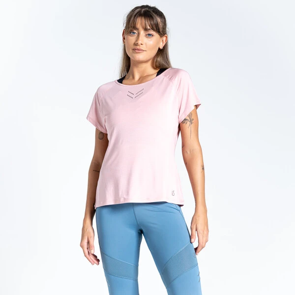 Das hoch atmungsaktive Cyrstallize Tee Dare 2b für Damen besteht aus Q-Wic Plus-Material, das Feuchtigkeit schnell ableitet, schnell trocknet und Geruchsbildung vorbeugt.