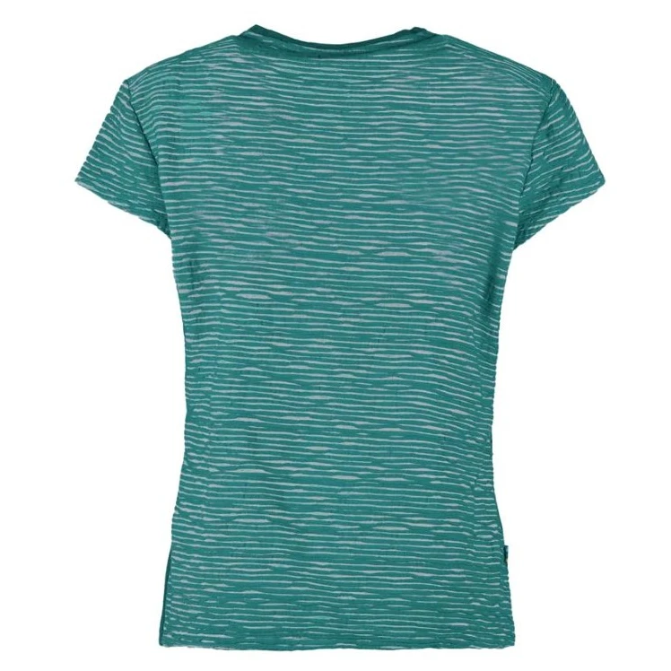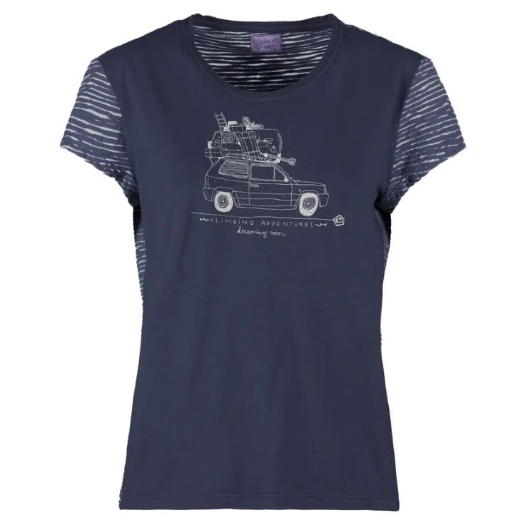 Das kurzärmelige Damen-T-Shirt Dream Women's von E9 besteht aus 87 % Bio-Baumwolle und 13 % Polyamid. Das T-Shirt hat Ärmel und einen Rücken aus Jacquardgewebe, was ihm ein frisches Aussehen verleiht, das durch den stilvollen Aufdruck auf der Brust noch unterstrichen wird. Es wird in Italien mit minimaler Umweltbelastung und mit Fokus auf extravagante Ausführung, einzigartiges Design und Komfort beim Klettern hergestellt.