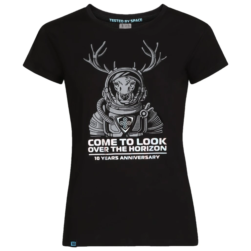 Kilpi Calypso-W ist ein T-Shirt in limitierter Auflage zum 10-jährigen Jubiläum der Marke Kilpi. Kurzarm-T-Shirt für Damen besteht aus sehr bequemem, leichtem und atmungsaktivem Material OPTI-DRY und ist mit einem originalen Astronauten-Rentier-Print bedruckt, der die Vision der Marke symbolisiert.
