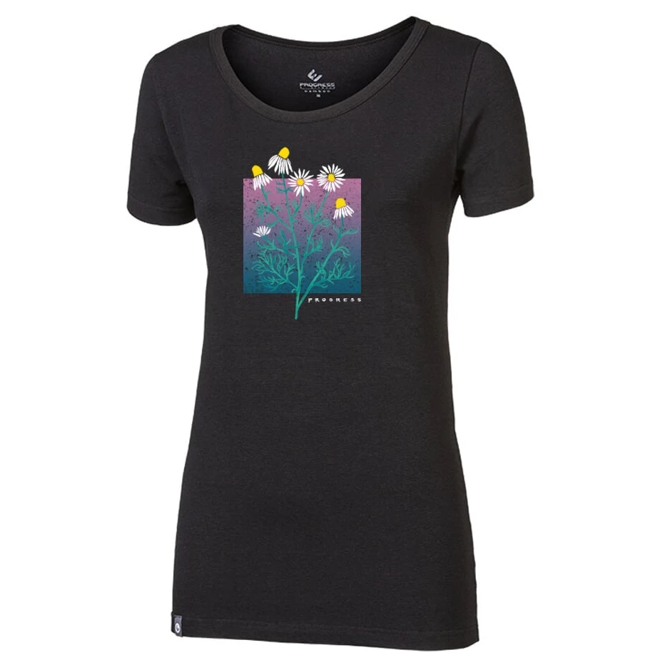 Sasa Camomile der Firma Progress ist ein Damen Kurzarm T-Shirt mit Aufdruck, aus Bambus mit Baumwollmischung. Dadurch liegt es sehr angenehm am Körper.
