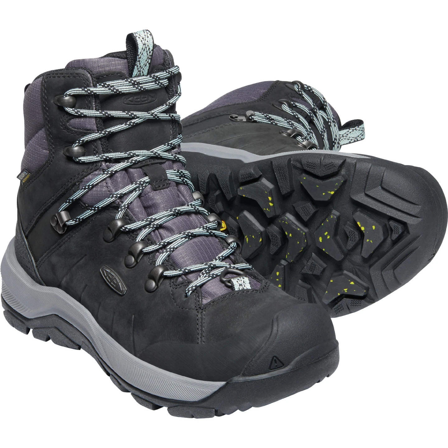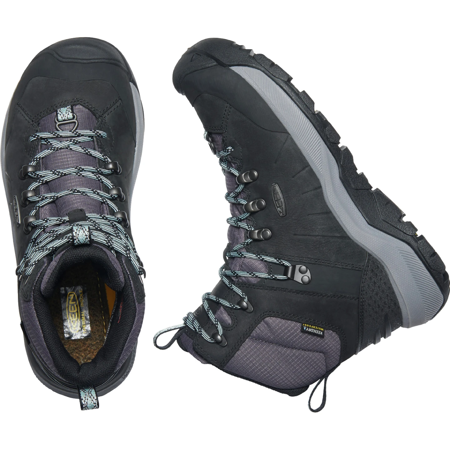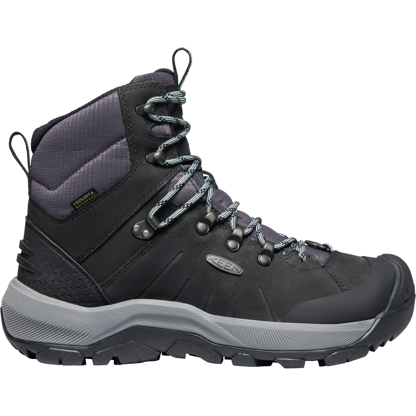 Damen-Trekkingstiefelette Revel IV MID Polar W von Keen. Isolierte Stiefelette. Sehr strapazierfähiger Winter-Trekkingschuh. Wasserdichtigkeit wird durch die KeenDry-Membran gewährleistet. Für die Isolierung sorgen 200 g recyceltes PETR KeenWarm. Für Traktion sorgt eine 5 mm dicke Außensohle mit multidirektionalem Muster, während die Traktion auf Eis durch KeenPolargewährleistet wird. Die Sohle hinterlässt keine Abdrücke. Das verwendete Leder wurde unter Berücksichtigung nachhaltiger Quellen verarbeitet. Die anatomische Aussparung auf der Rückseite des Kamins erleichtert den Abstieg.