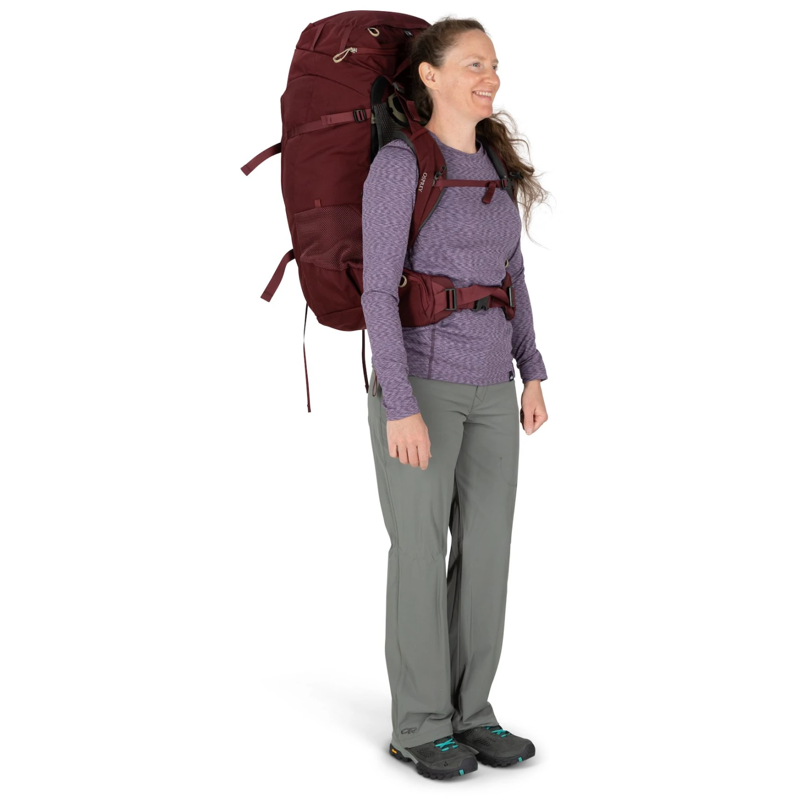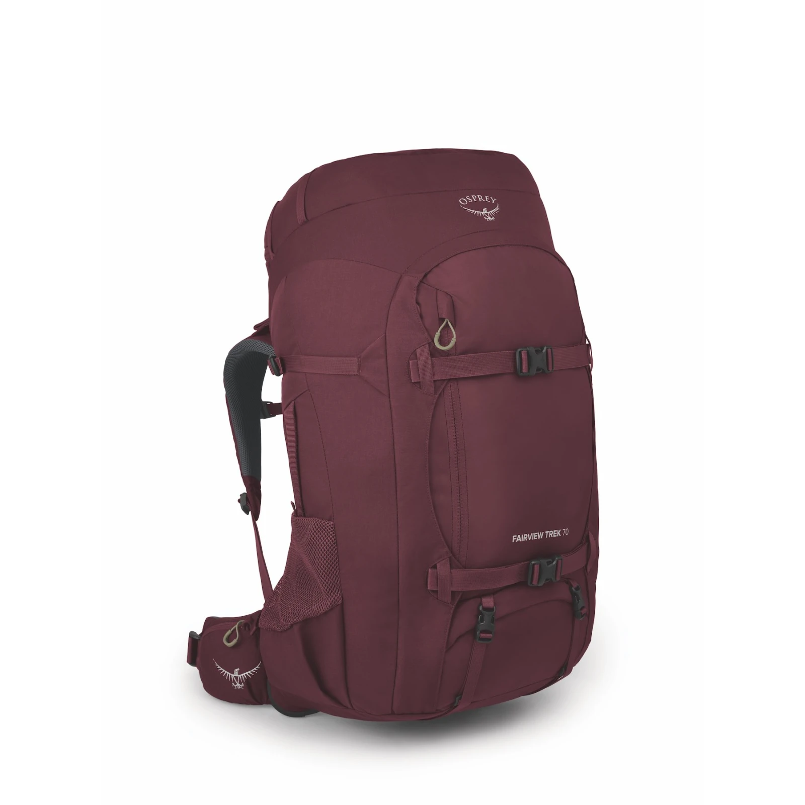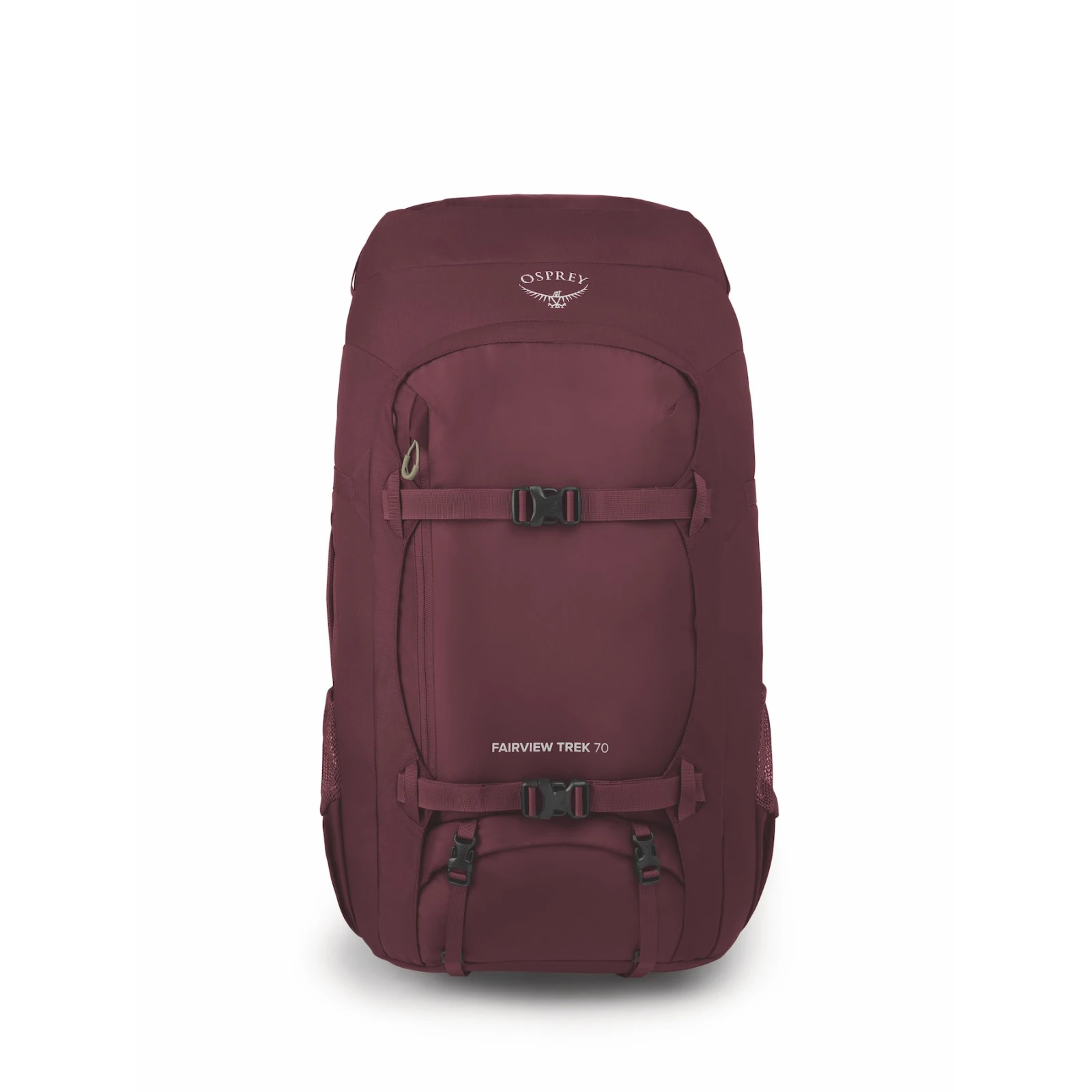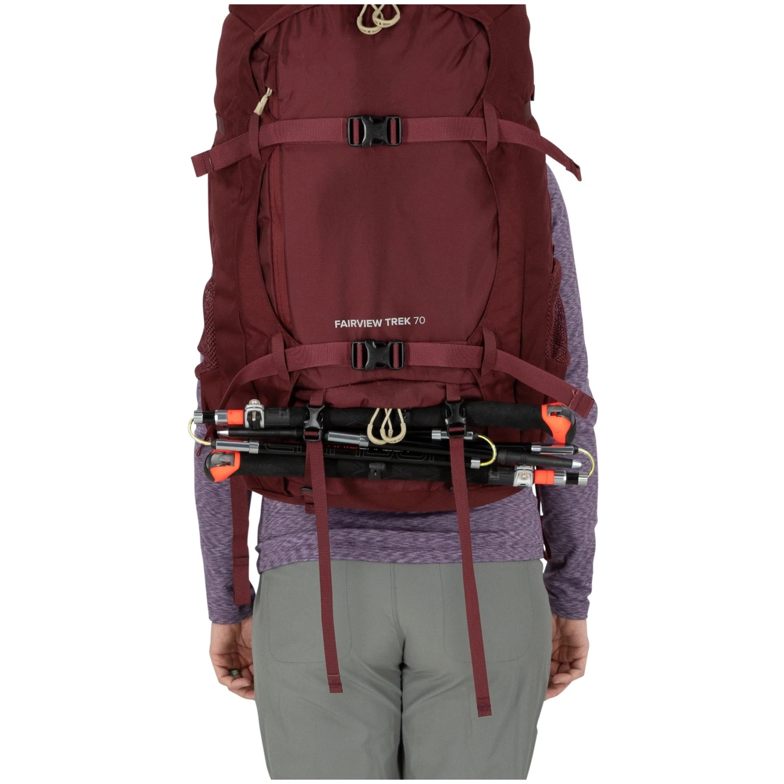 Der Damen-Rucksack Fairview Trek 70 von Osprey ist ein technisch ausgereifter Rucksack, den Sie auf einer Wanderung oder auf Reisen zu schätzen wissen werden. Mit einem Volumen von 70 Litern können Sie alle notwendigen Dinge darin verstauen. Er ist mit einem anpassbaren AirSpeed™-Rückensystem ausgestattet, das dank 3D-Stretch-Mesh für eine perfekte Belüftung im Rückenbereich sorgt. Ergänzt wird das Panel dann noch durch bequeme, atmungsaktive und verstellbare Schultergurte, welche durch einen Brustgurt mit Pfeife und einen gepolsterten Hüftgurt mit Schnalle ergänzt werden. Der Rahmen aus 4mm-Draht LightWire sorgt für eine optimale Gewichtsverteilung beim Tragen.