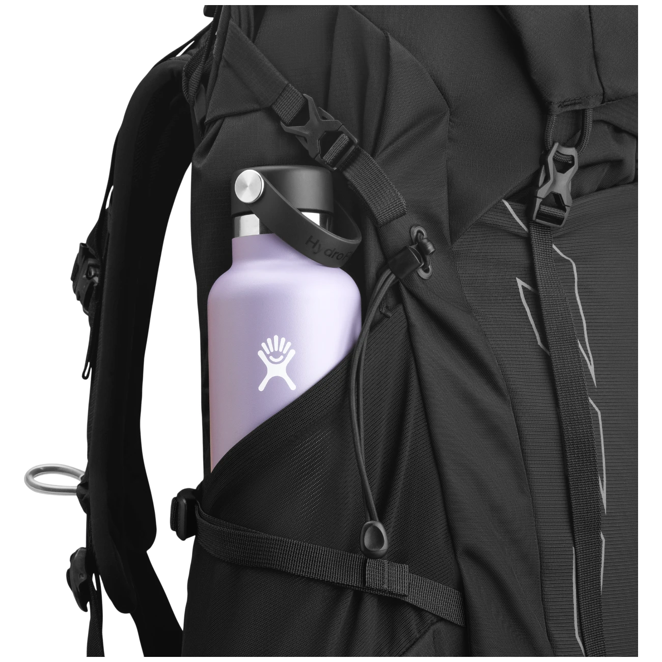Top-Loading mit Deckel und Kordelzug ermöglicht einfachen Zugriff auf das Innere durch eine weite Hauptöffnung; im Inneren finden Sie eine große Kammer. Das zweite Reißverschlussfach befindet sich ganz unten und eignet sich optimal für einen Schlafsack. Der Rucksack verfügt außerdem über eine von außen zugängliche obere Reißverschlusstasche , eine Reißverschlusstasche aus Netzmaterial mit einem Schlüsselclip im Inneren, eine Trinkblasentasche, Seitentaschen, eine große Vordertasche und zwei Reißverschlusstaschen am Hüftgurt. Riemen an der Außenseite ermöglichen die Befestigung einer Isomatte und eines Eispickels. Beim Wandern werden Sie das Stow-On-The-Go-Schnellverschlusssystem für Trekkingstöcke sicherlich zu schätzen wissen. Selbstverständlich sind an den Seiten Kompressionsriemen vorhanden, die das Volumen des Rucksacks auf ein Minimum reduzieren.