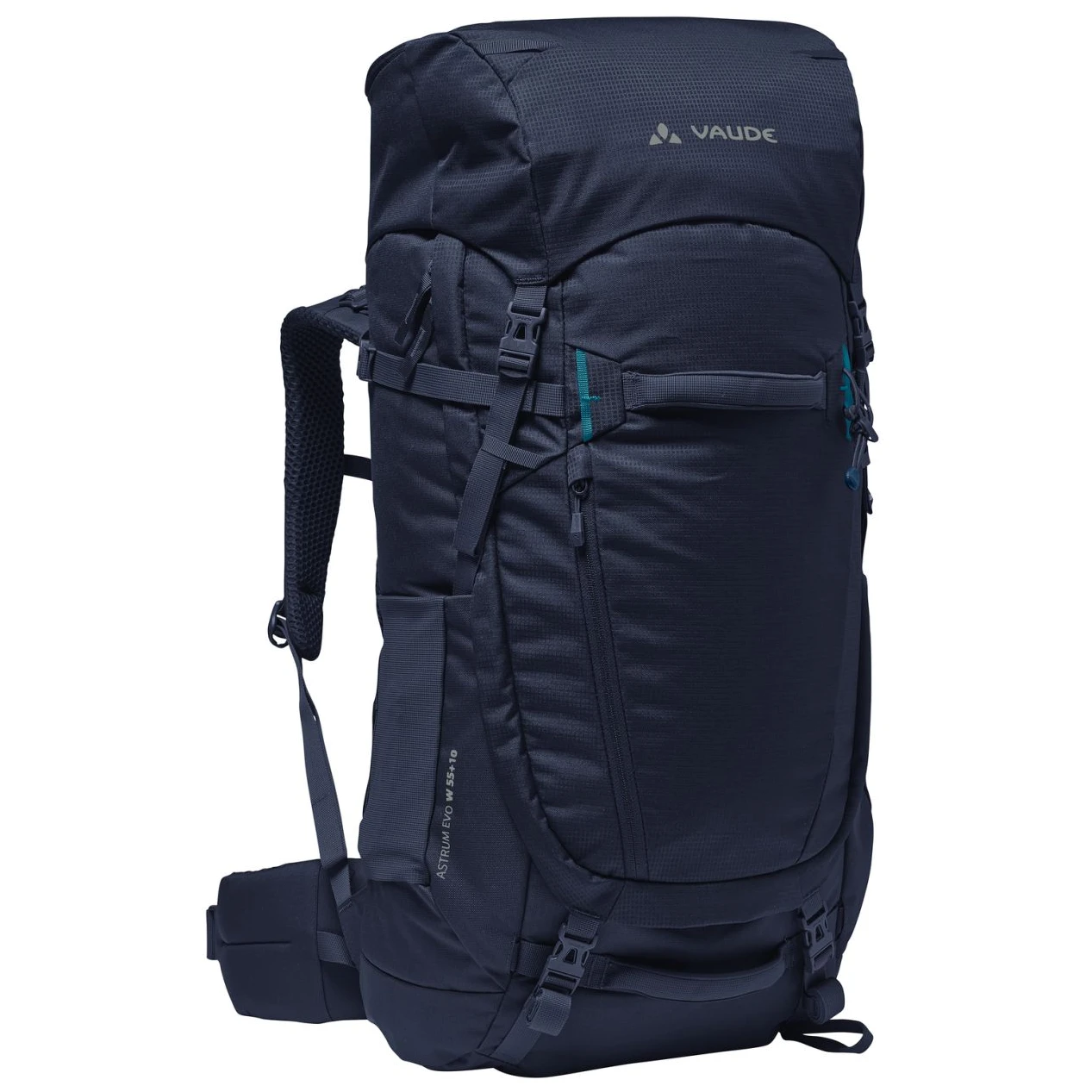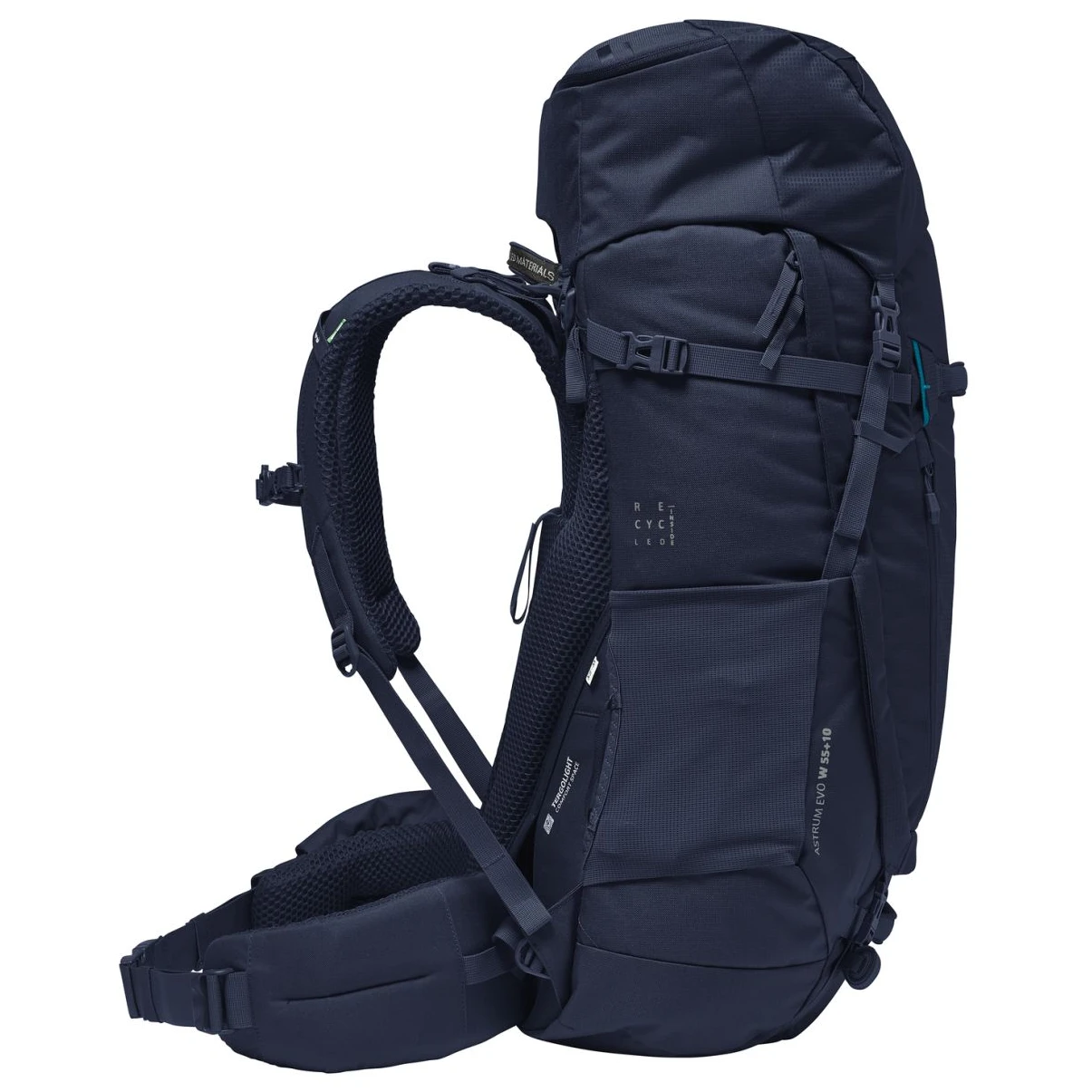 Vielseitiger Trekkingrucksack für Damen DerWomen's Astrum EVO 55+ 10 der Marke Vaude verfügt über ein Volumen von 65 Litern und mehrere praktische Taschen. Das Tergolight Comfort Space -System trägt zur Druckentlastung im unteren Rücken bei. Das Lendenwirbelkissen entlastet Ihr empfindliches Iliosakralgelenk bei mittelschweren Fahrten und hilft, Schmerzen im unteren Rückenbereich vorzubeugen. Die Rückenlänge ist stufenlos verstellbar und die oberen Gurte lassen sich zur Belastungsverteilung individuell anpassen. Ergoshape - Ergonomische Schultergurte sorgen für optimale Bewegungsfreiheit und zusätzlichen Tragekomfort bei Ihrem nächsten Berg-, Trekking- oder Wanderausflug. Die Ergoshape-Schultergurte sind dort breiter, wo sie auf Ihren Schultern aufliegen, und vorne und unter den Armen schmaler.