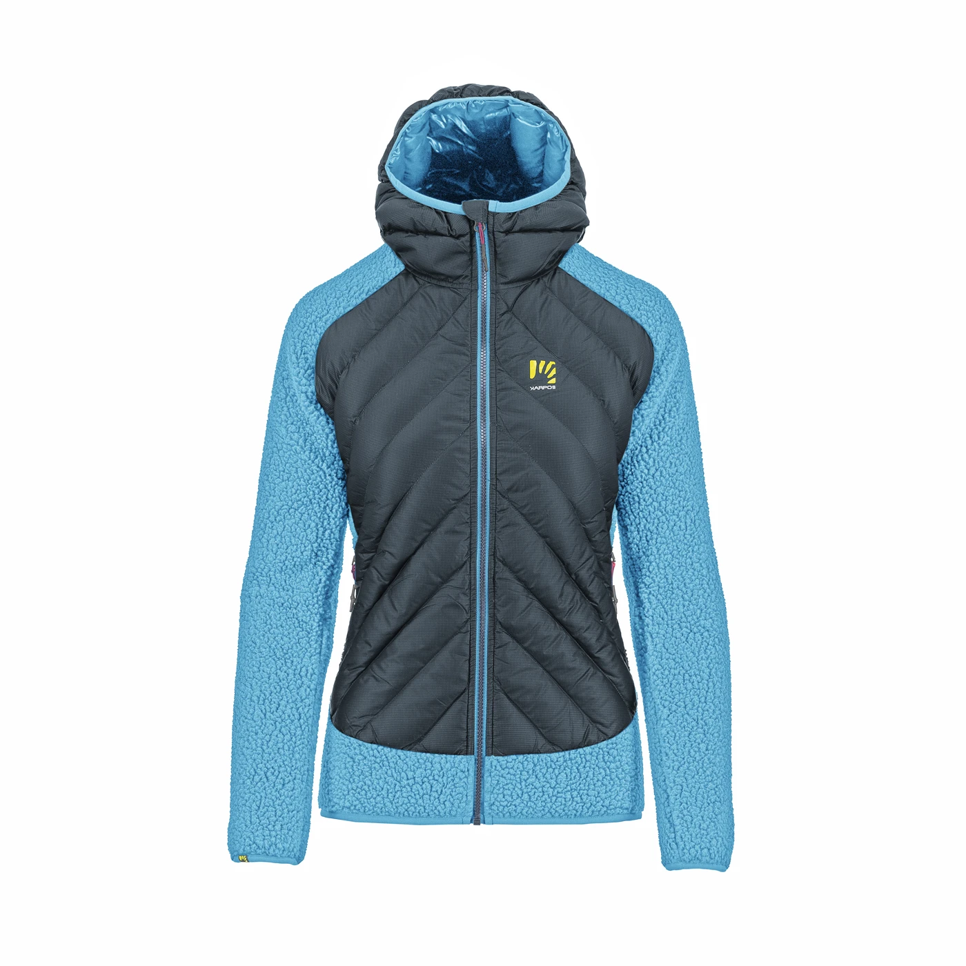 Damen Winterjacke Marmarole aus echten Daunen. Die Hybridjacke kannst du bei vielen Winteraktivitäten nutzen und sie wird dich schützen. Einzigartiges Design und Markenqualität Karpos. Der Hauptteil der Jacke und die Kapuze bestehen aus hochabriebfestem Cordura®-Gewebe, isoliert mit 750er-Entendaunen.