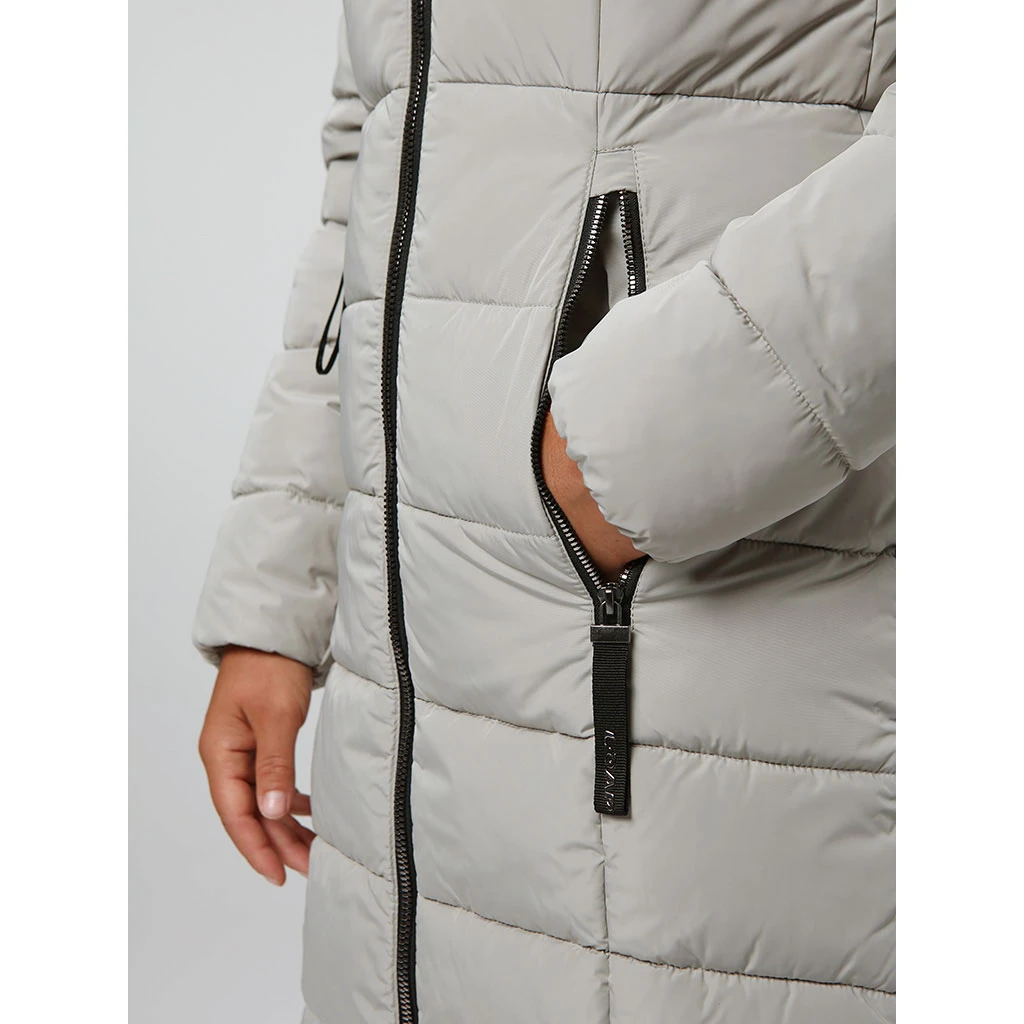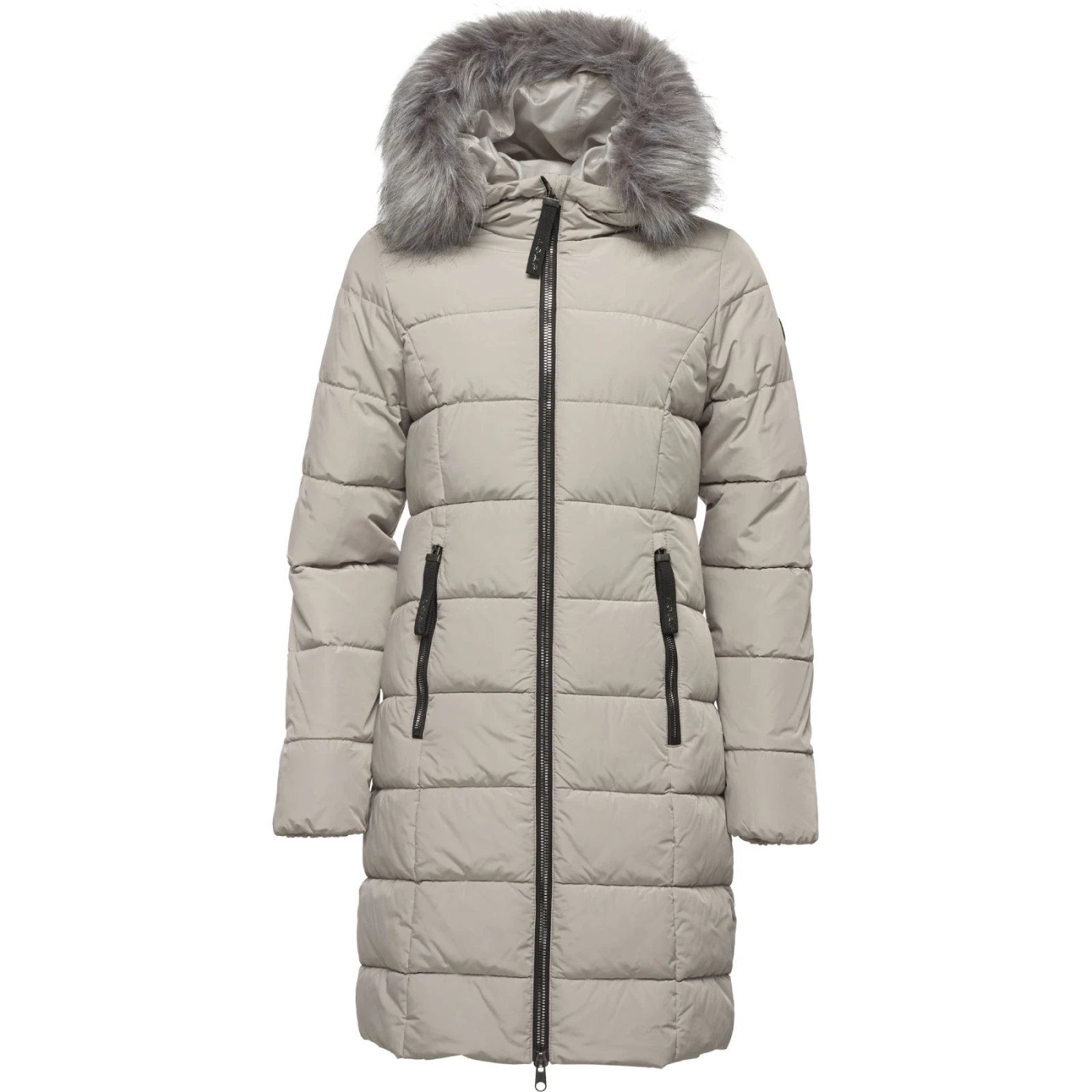 Zu den praktischen Features des Mantels gehören ein Zwei-Wege-Reißverschluss mit Knochenmuster, der ein einfaches Öffnen von beiden Seiten ermöglicht, und eine Kapuze mit abnehmbarem Fell, die den stylischen Look abrundet und zusätzlichen Schutz bietet. Ärmel mit innenliegendem elastischem Kordelzug und zwei geräumige Reißverschlusstaschen sorgen für Funktionalität und Tragekomfort, egal ob auf dem Weg zur Arbeit oder auf einem Winterausflug.