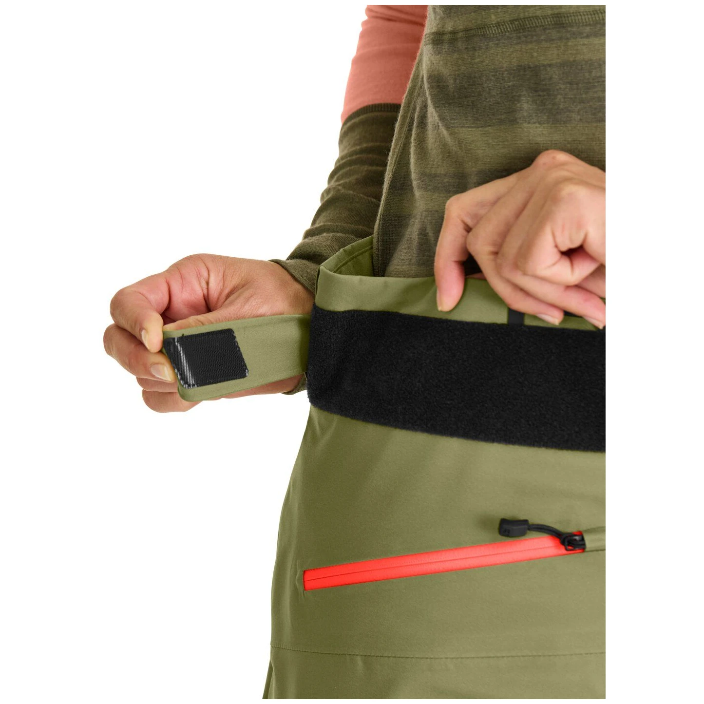 Die Hose lässt sich in der Taille durch einen Klettverschlussenger schnallen, außerdem sind Schlaufen für Hosenträger vorhanden. Auch in Kombination mit dem Sicherheitsgurt setzt Sie nichts unter Druck. Befestigen Sie die Taille mit einem Metallknopf. An der Beininnenseite befinden sich integrierte Skischuhüberzüge, die maximalen Schutz vor eindringendem Schnee bieten. Der untere Teil der Beine ist mit Dyneema- und Cordura-Materialien verstärkt, um Skikanten oder Steigeisen standzuhalten.