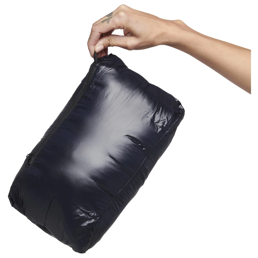 Die Jacke lässt sich in einer Tasche mit Karabinerschlaufe verstauen.