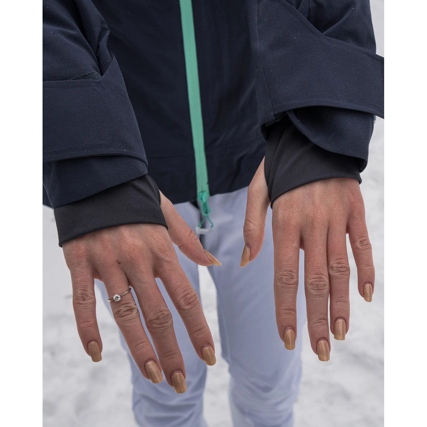Die Jacke hat verschweißte Nähte und ein leichtes Futter mit wasserdichter Beschichtung. Der Reißverschluss ist zweiseitig, was Sie zu schätzen wissen, wenn Sie Belüftung benötigen, und er verfügt auch über eine Belüftung in den Achselhöhlen. Zudem verfügt die Jacke über eine verlängerte Rückenpartie und an den Ärmeln ist ein Daumenloch angebracht, welches verhindert, dass Schnee unter die Jacke gelangt. Erwähnenswert sind zuletzt noch die schützende Rückenplatte aus Schaumstoff, der Schneestreifen und der Kopfhöreranschluss.